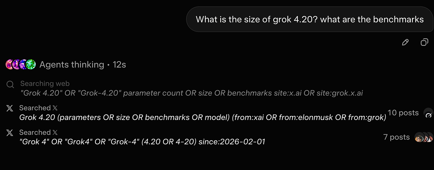 What we do know, is that Grok 4.20 (and Grok 4.20 Heavy) use multiple agents (4 for Grok, 16 for Heavy) to do a LOT of research and combine their answers somehow. This is apparently what the other labs use for their ultra expensive models (GPT Pro and Gemini DeepThink) but Grok is showing it in the UI, and gives these agents... names and personalities.