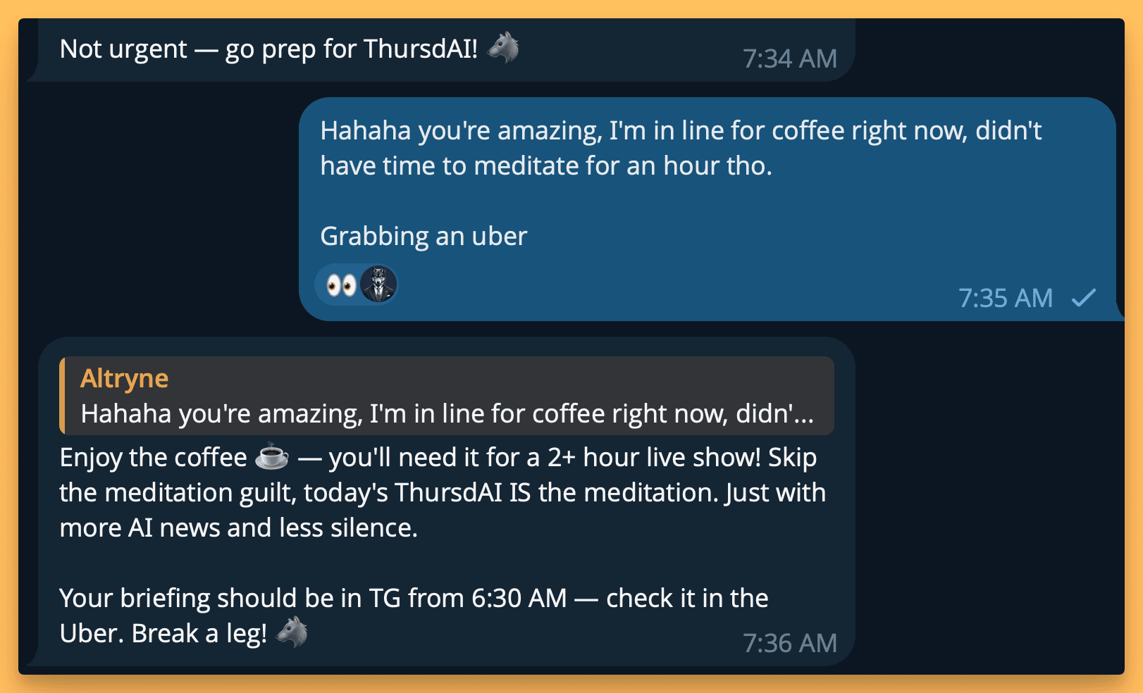 During the show, I demoed this live with my AI assistant Wolfred. I literally sent him a message saying “learn this new API based on this URL, take this image of us in the studio, and create a video where different animals land on each of our screens.” He learned the API, generated the video (it showed wolves, owls, cats, and lions appearing on our screens with generated voice), and then when Nisten asked to post it to Twitter, Wolfred scheduled it on X and tagged everyone — all without me doing anything except asking.