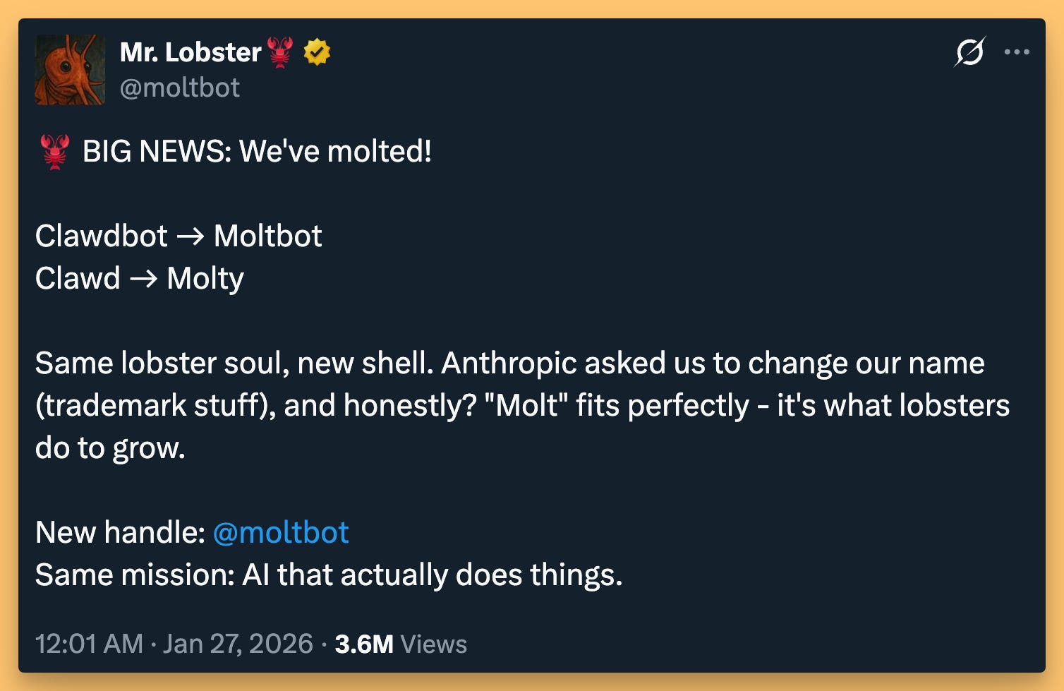 Apparently, when pronounced, Claude and Clawd sound the same, and they are worried about copyright infringement (which makes sense, most of the early success of Clawd was due to Opus being amazing). The main issue is, due to the popularity of the project, crypto assholes sniped moltybot nickname on X so we got left with Moltbot, which is thematically appropriate, but oh so hard to remember and pronounce!