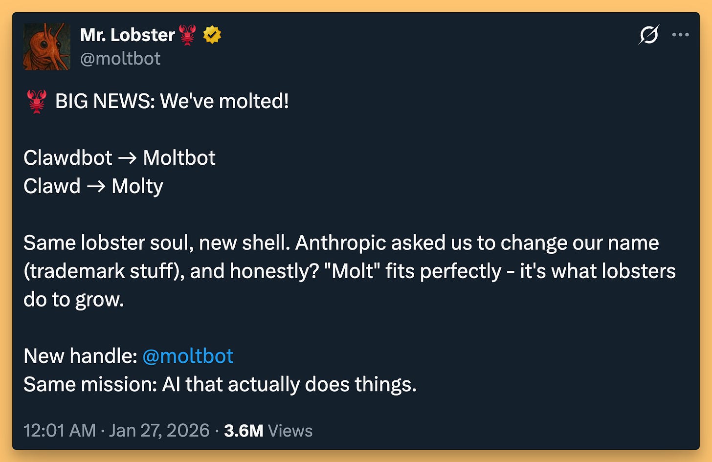 Moltbot as the name (apparently because crypto scammers stole a better name)EDIT: just after publishing this newsletter, the name was changed to OpenClaw, which we all agree is way way better.