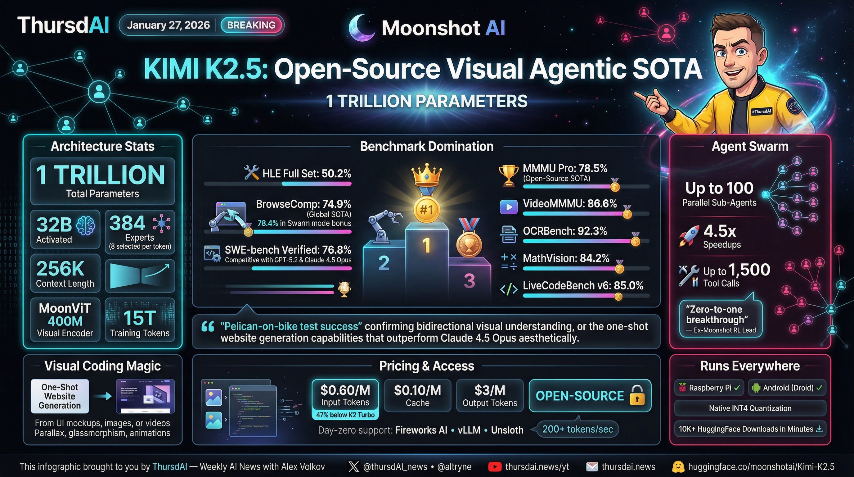 Wolfram’s favorite release of the week, and for good reason. Moonshot AI just dropped Kimi K2.5, and this thing is an absolute beast for open source. We’re talking about a 1 trillion parameter Mixture-of-Experts model with 32B active parameters, 384 experts (8 selected per token), and 256K context length.