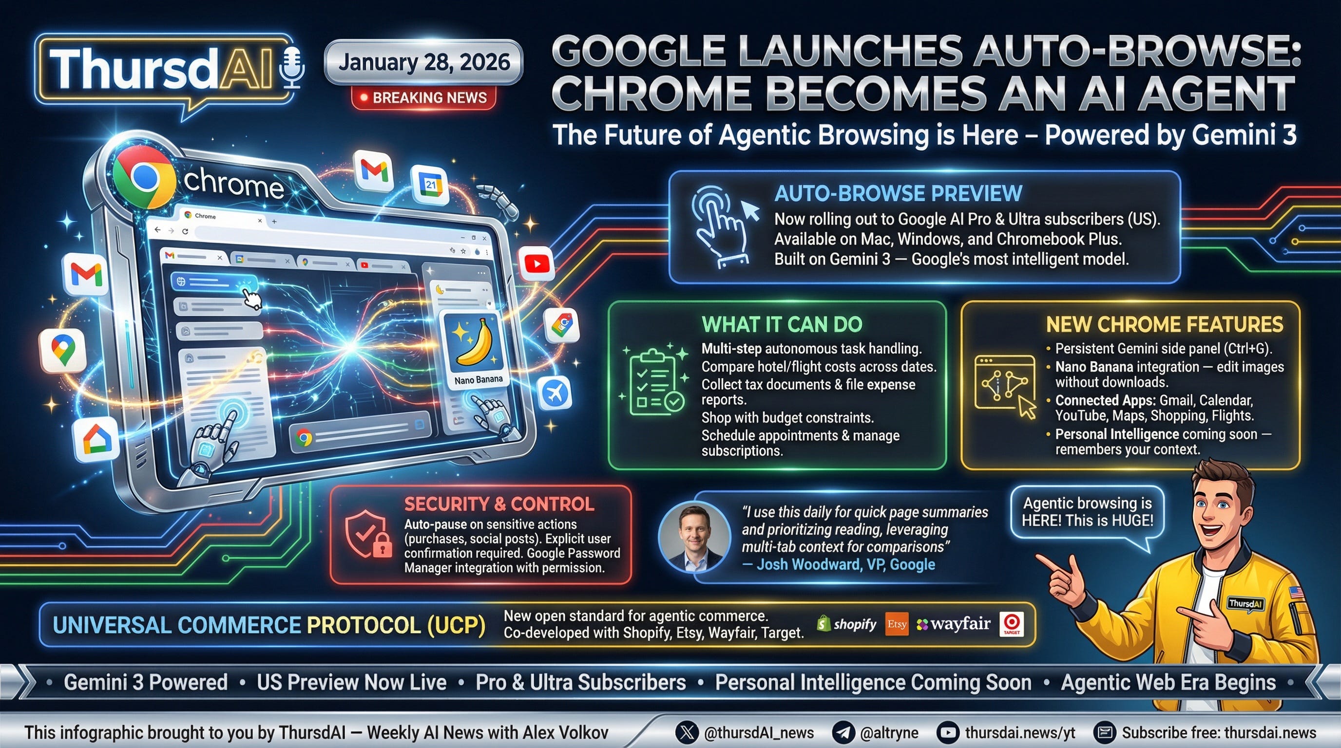 This wasn’t the only mind blowing release from Gemini this week, the Chrome team upgraded the Gemini inside chrome to be actual helpful and agentic. And yes, we’ve seen this before, with Atlas from OpenAI, Comet from perplexity, but Google’s Chrome has a 70% hold on the browser market, and giving everyone with a Pro/Ultra subscription to “Auto Browse” is a huge huge deal.