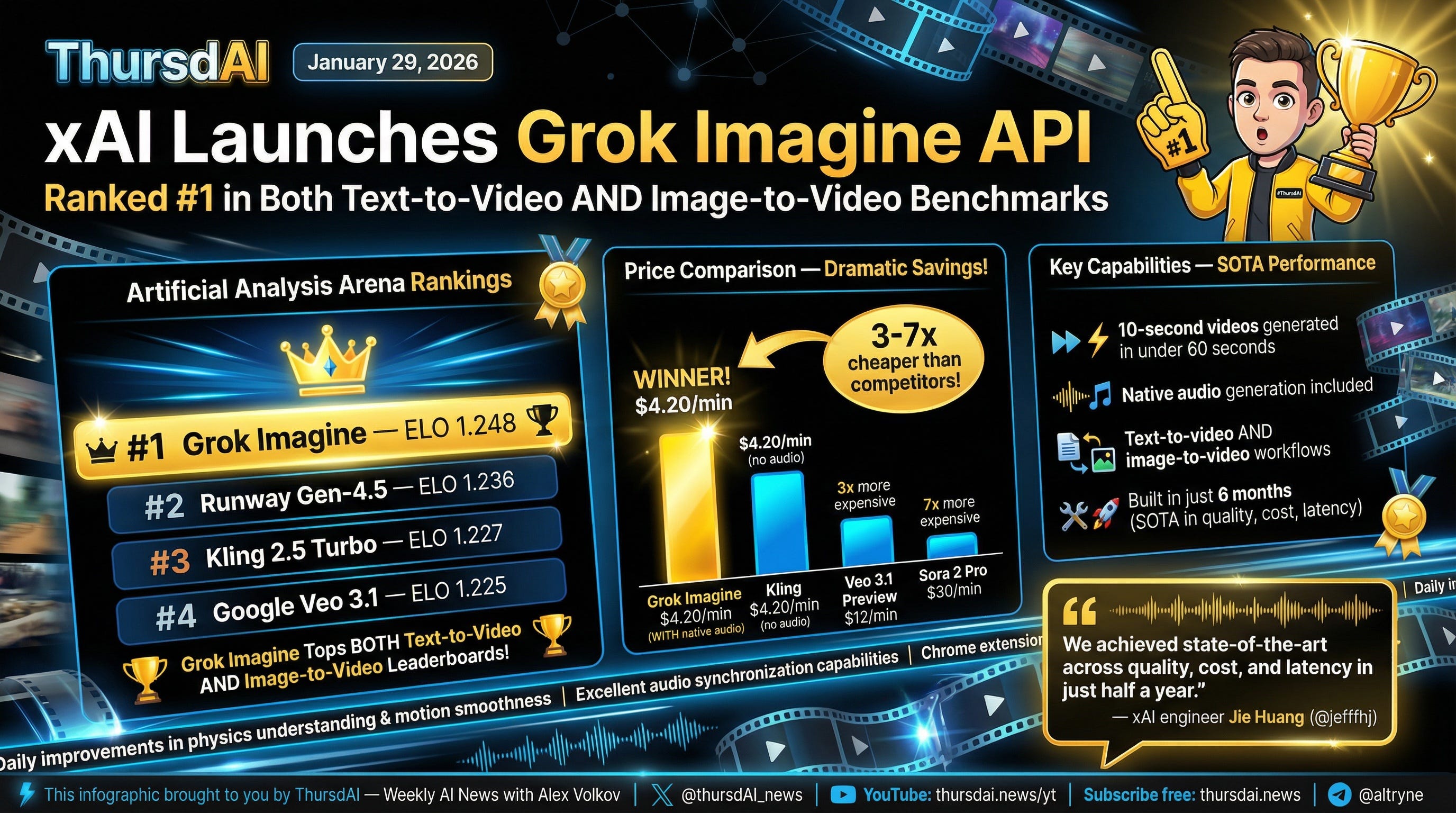 Meanwhile in Open Source, Moonshot followed up with a .5 update to their excellent Kimi, our friends at Arcee launched Trinity Large (400B) and AI artists got the full Z-image. oh and Grok Imagine (their video model) now has an API, audio support and supposedly match Veo and Sora on quality while beating them on speed/price.