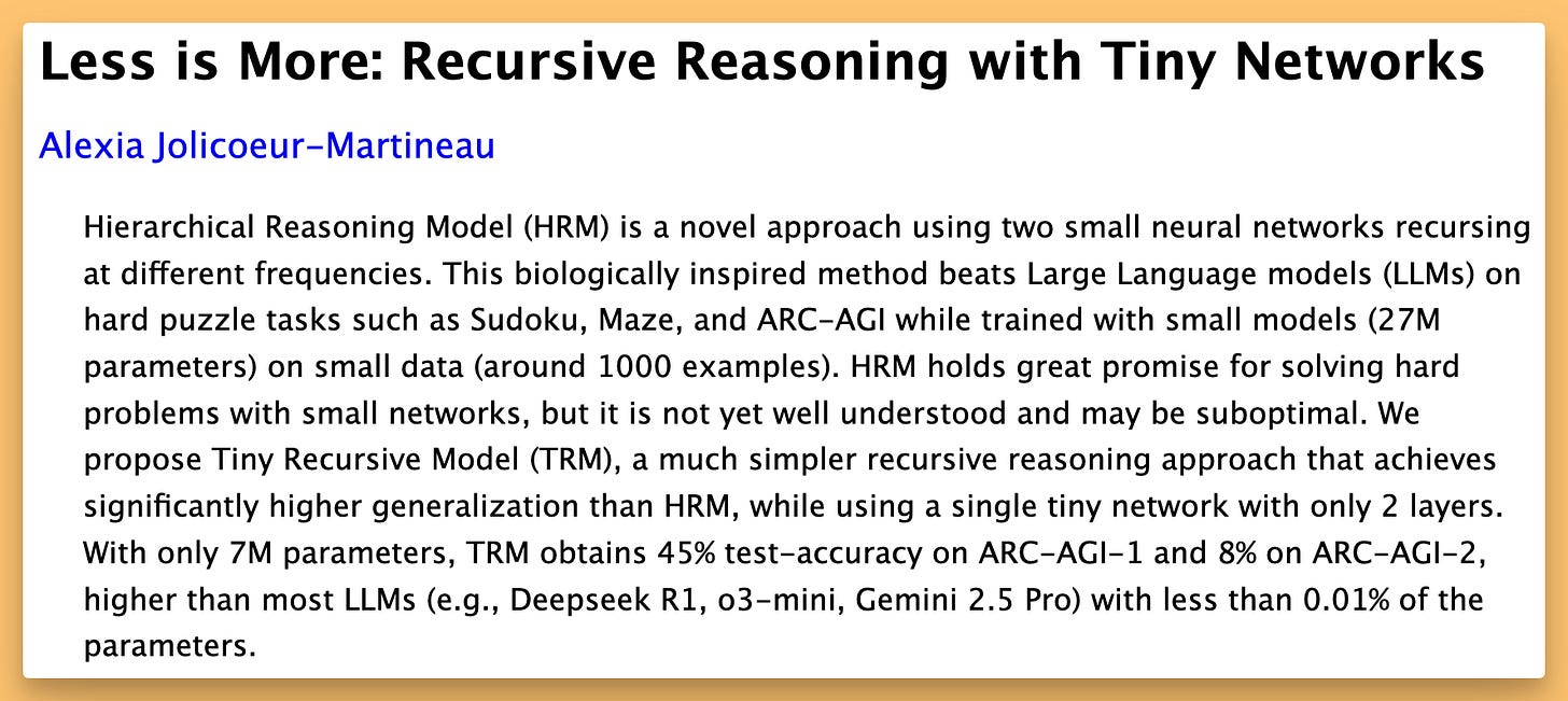 This was the release that had everyone’s jaws on the floor. A single researcher from the Samsung AI Lab in Montreal released a paper on a Tiny Recursive Model (TRM). Get this: it’s a 7 MILLION parameter model that is outperforming giants like DeepSeek-R1 and Gemini 2.5 Pro on complex reasoning benchmarks like ARC-AGI. I had to read that twice. 7 million, not billion.