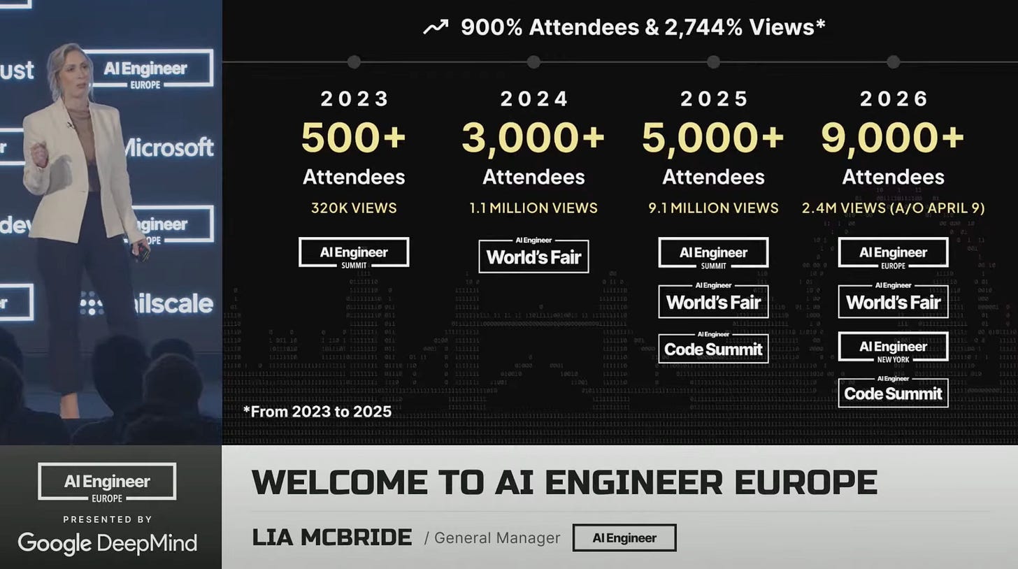 The tools became incredibly better, in a way that I think even the most AGI pilled of us back then could not have predicted, and so has the conference itself. AI Engineer has grown nearly 1000% since then (per Lia McBride, now GM of AI Engineer and a huge part of why this conf runs so smoothly), in both attendees and reach (Check out the YT channel, it’s nearing 350K subs and has some of the highest quality content available, but is also a sort of time machine to how we were all collectively thinking about AI Engineering just a 2.5 years ago)