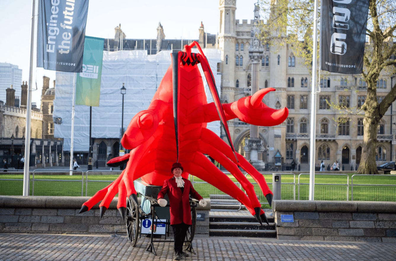 If you ever had any doubts of whether an AI Engineer ticker was “worth it”, it is. If you had doubts of whether you should apply to talk at one of the upcoming events, you should. And if you ever doubted that an AI Agent can find and order a British yeoman-clad gentlemen to stand outside of a venue for two days propping a cart with a huge giant fucking inflatable red lobster ... well, I have some pictures for you to convince you otherwise.