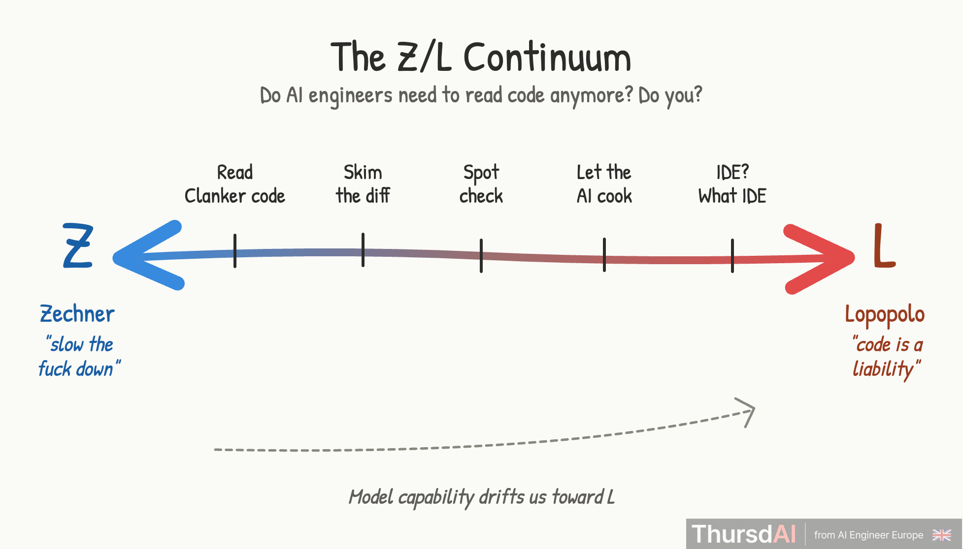 On day 1 opening keynote, Ryan Lopopolo from OpenAI took the stage and said “code is a liability” and that we should all strive to be “token billionaires” - and on the last day, Mario Zechner of Pi got standing ovations after he told folks to “slow the fuck down” and “read every fucking line of critical code” - this debate happened in every hall conversation, every dinner (speaker or otherwise) and I bet it happens in every company adopting these tools. So ask yourself, where are you on the Z/L Continuum today? Where will you be in 6 months? in 12?