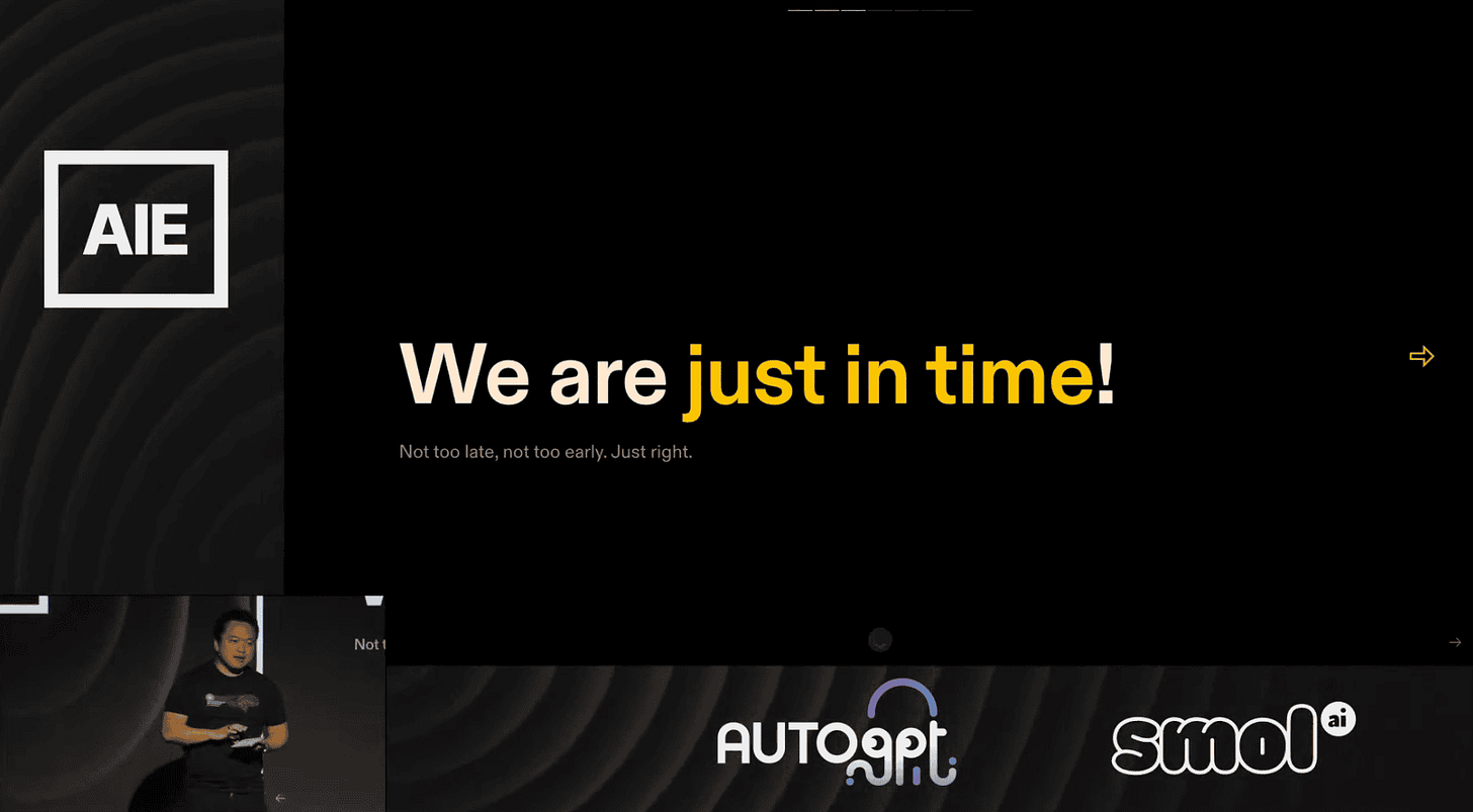 And still, the hotel Nico was buzzing with people who saw the opportunity, who could imagine where this was all going, who were already getting “AGI Pilled“, building agents (anyone remember AutoGPT? big sponsor at that first conference, talk about being too early!). “We are just in time!” Swyx told the 600 or so hand selected folks at the AIE Summit, not too early, not too late, just right. Well I have something to say to 2023 Swyx, we were ALL so early!