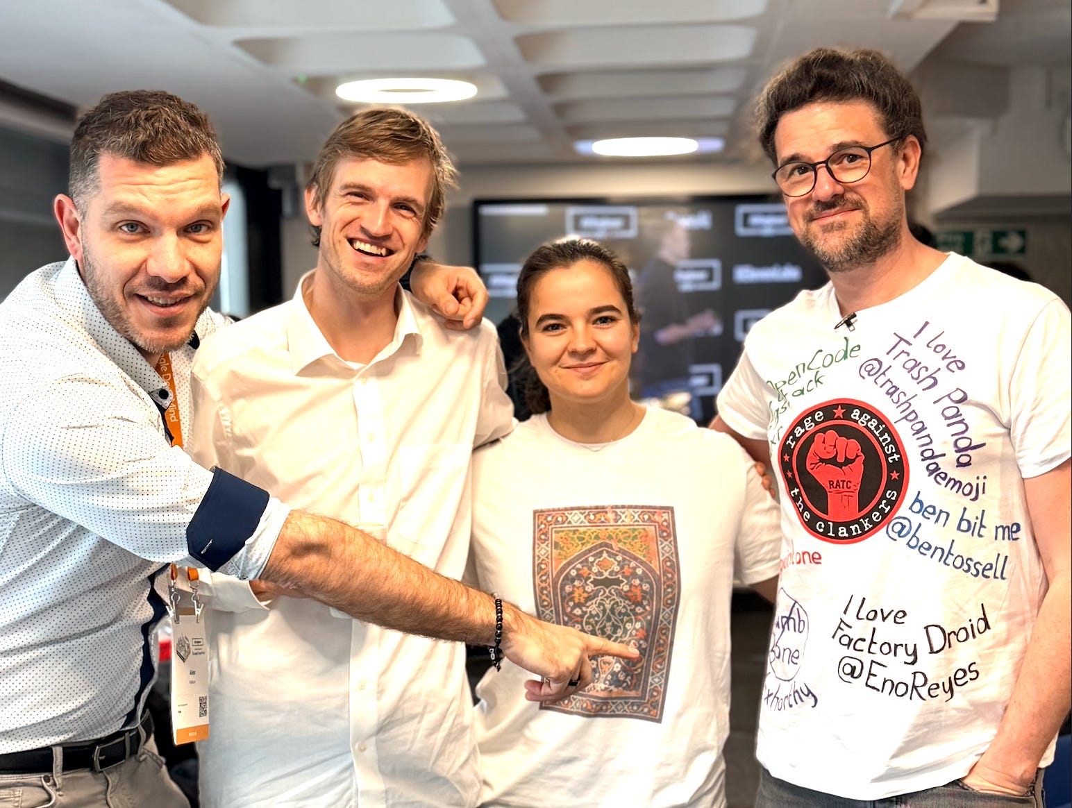 Speaking of Mario Zechner, when he went to give his (I predict, MVP talk of the conference) talk, in a billboard charity t-shirt, something weird happened. I’ve never seen a room of speaker all preparing for their own talks, and are excited for the opportunity to chat with each other, all quiet down and listen as intently. There’s a live screen in the room of the main stage, but usually people don’t pay that much attention to what’s going on on stage. This time, everyone just... quieted down and listened to Mario tell a room full for AI Psychosis having engineers, to SLOW THE FUCK DOWN. It was glorious. He also got a standing ovation when he got off stage which is also, I think a first time I’ve seen this.