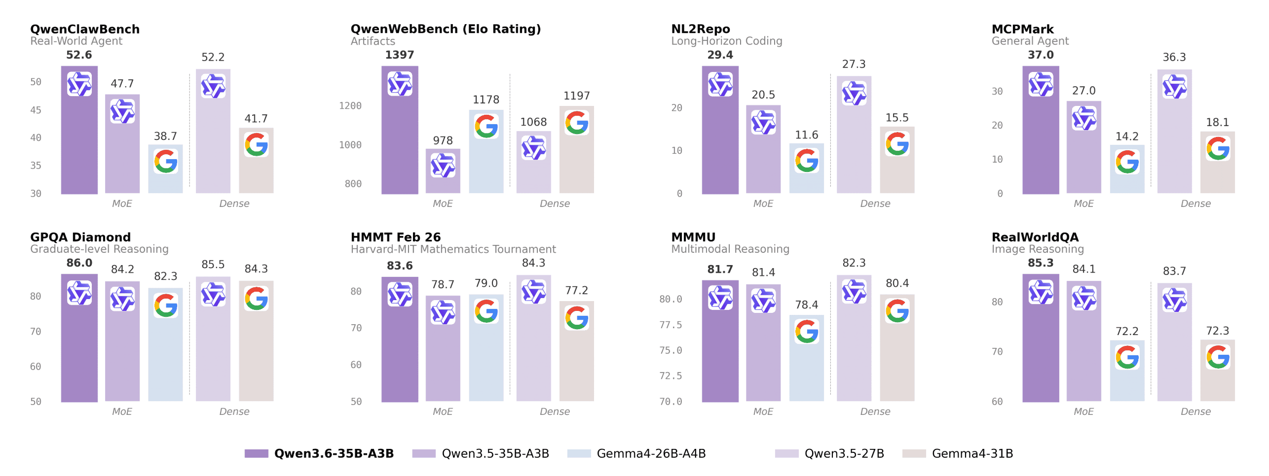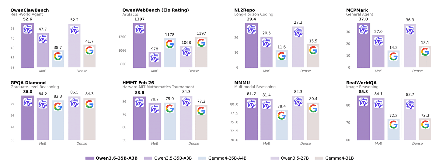 Another highlight for me in this model, is that Alibaba has an OpenClaw bench (that they are promising to release soon) and that this model does as well as the dense model and beating Gemma 4 by a wide margin on that task.
