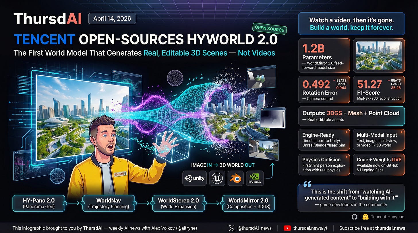 Tencent HYWorld 2.0 takes a single image (or text, or video) and produces actual 3D Gaussian Splats, meshes, and point clouds that you can import directly into Unity, Unreal, Blender, or NVIDIA Isaac Sim. Not video. Real editable 3D assets. Their framing: “watch a video, then it’s gone” vs “build a world, keep it forever.” The WorldMirror 2.0 reconstruction model is a 1.2B parameter feed-forward model that predicts dense point clouds, depth, normals, camera params, and 3DGS in a single pass. All open source.