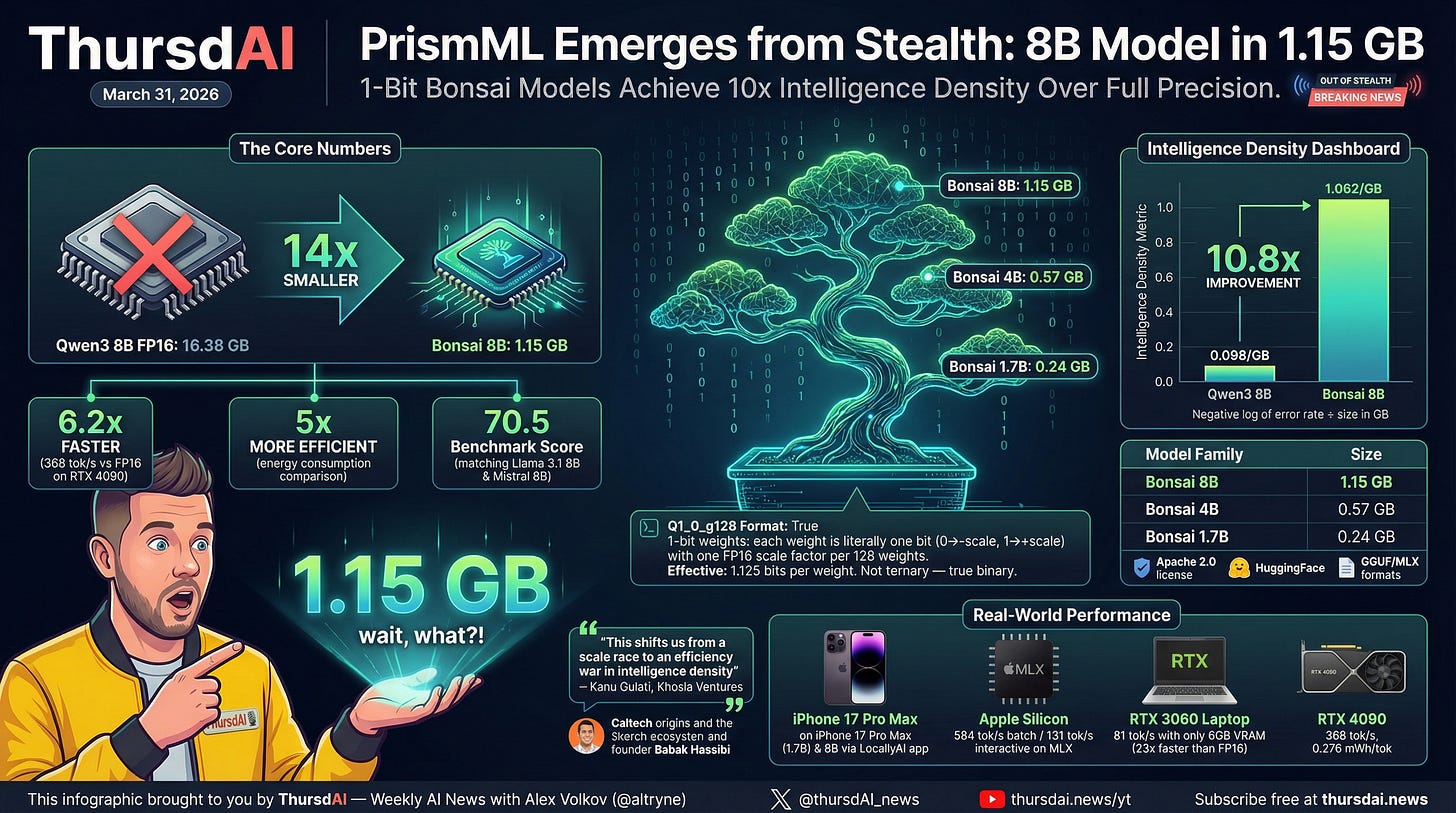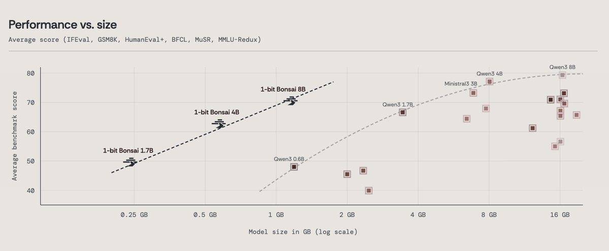 PrismML emerged from stealth this week with their 1-bit Bonsai model family. Their 8B model is 1.15 gigabytes. A full-precision Qwen3 8B is 16 gigabytes. That’s a 14x size reduction, with no significant quality loss.