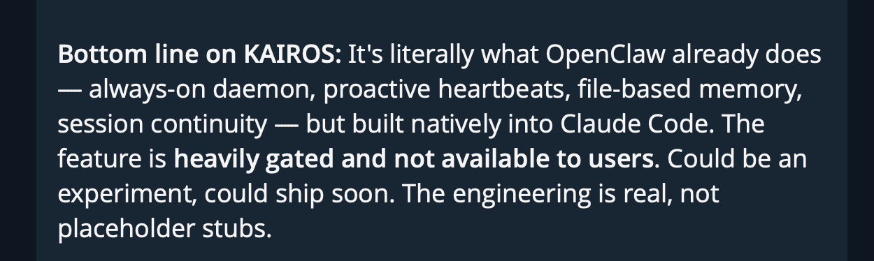 This is the biggest take-away from this leak IMO, that like OpenClaw/Hermes agentic harnesses, Claude Code is already a fully featured proactive agent, we just don’t have access to this yet. With KAIROS, Claude Code will have it’s own daemon (will run independently from the CLI), will have a background ping system (hello Heartbeat.md from OpenClaw) that will make it wakeup and do stuff, will do “autodream” memory consolidation reviewing your daily sessions and fix memories, subscribe to Github, and maintain daily appent-only logs to show you what it did while it and you were asleep.