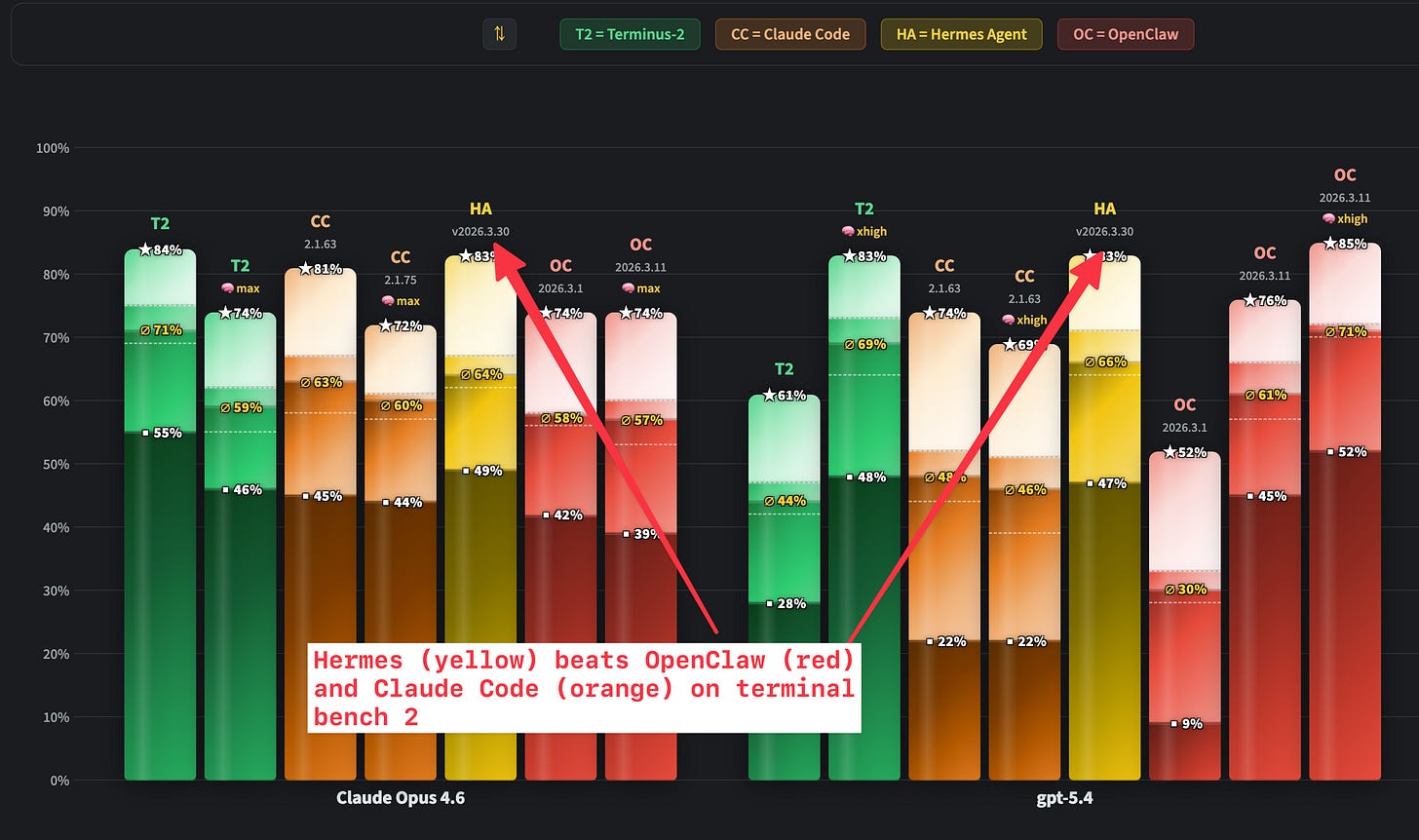 I’ve tasked Wolfram to expand our findings, and he tested the new Hermes Agent (from Nous Research) against OpenClaw, Claude Code and found that... drum roll... Hermes Agent performs way better on Terminal Bench, than either Claude Code and OpenClaw. 😮