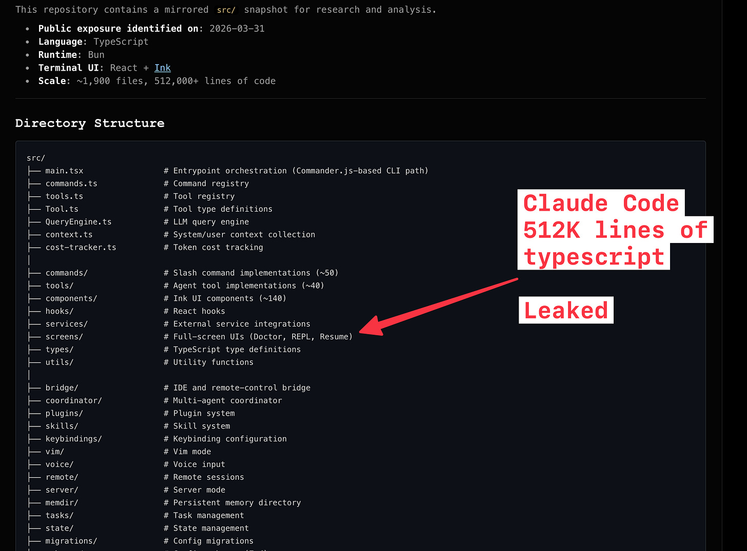 So here’s what happened. On March 31st, Anthropic shipped Claude Code version 2.1.88 to npm. Inside that package was a 59.8 megabyte source map file — basically a debugging artifact that contained the entire compiled source code. 512,000 lines of TypeScript across 1,900 files. The entire playbook for how the Claude Code harness works, including a lot of stuff that wasn’t supposed to be public yet.