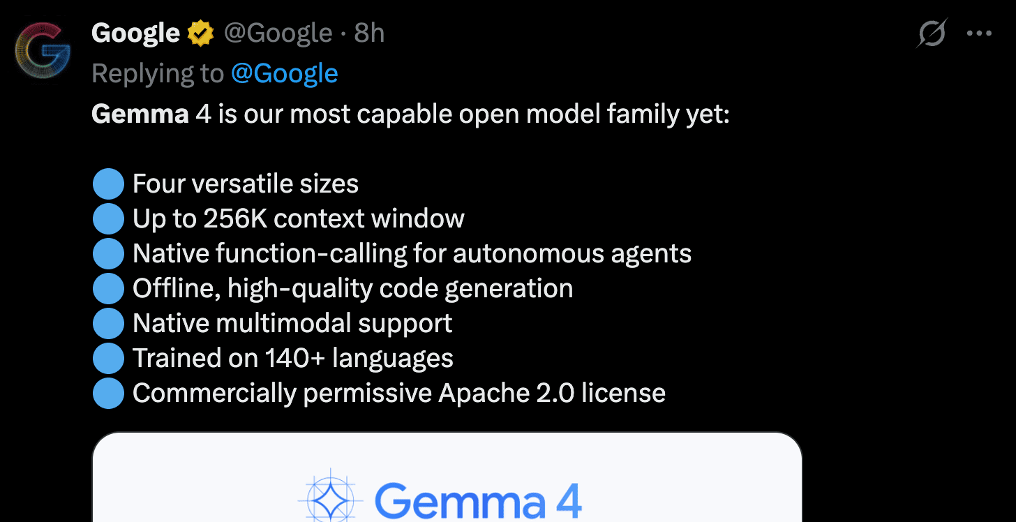 Right in the middle of all the Anthropic chaos, Google dropped Gemma 4, and Omar Sanseviero from DeepMind joined us live to talk through it. This launch hit a bunch of notes I care a lot about: strong local-friendly sizes, serious open distribution, Apache 2.0 licensing, agentic improvements, and a clear willingness to listen to community feedback.