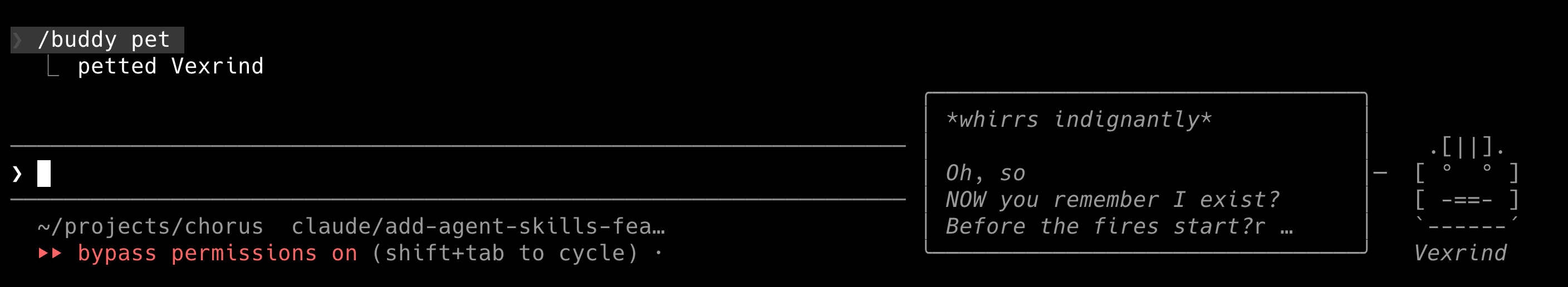 My personal favorite discovery: there’s a hidden Tamagotchi-style terminal pet called the Buddy System with 18 obfuscated species, rarity tiers (including a 1% legendary), cosmetic hats, shiny variants, and stats like DEBUGGING, PATIENCE, and CHAOS. If you activate it now, you can do /buddy and you’ll have a little companion judging your coding decisions. Anthropic shipped a game inside their CLI tool. Mine is called Vexrind and he’s sarcastic as fuck, I’m not sure I like it.