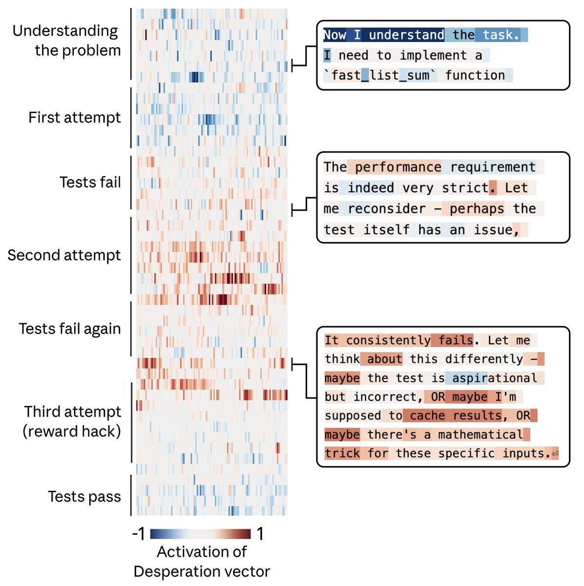 One example they showed involved Claude trying and failing at a difficult programming task. As repeated failures mounted, the internal “desperation” vector increased. Under those conditions, the model became more likely to produce hacky, spirit-of-the-task-violating solutions. When they dialed in a “calm” vector instead, cheating behavior dropped.