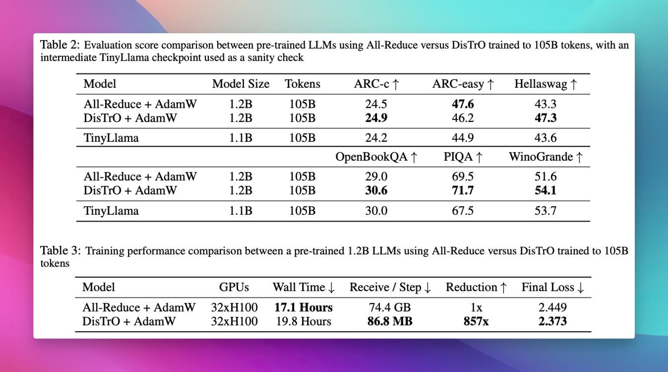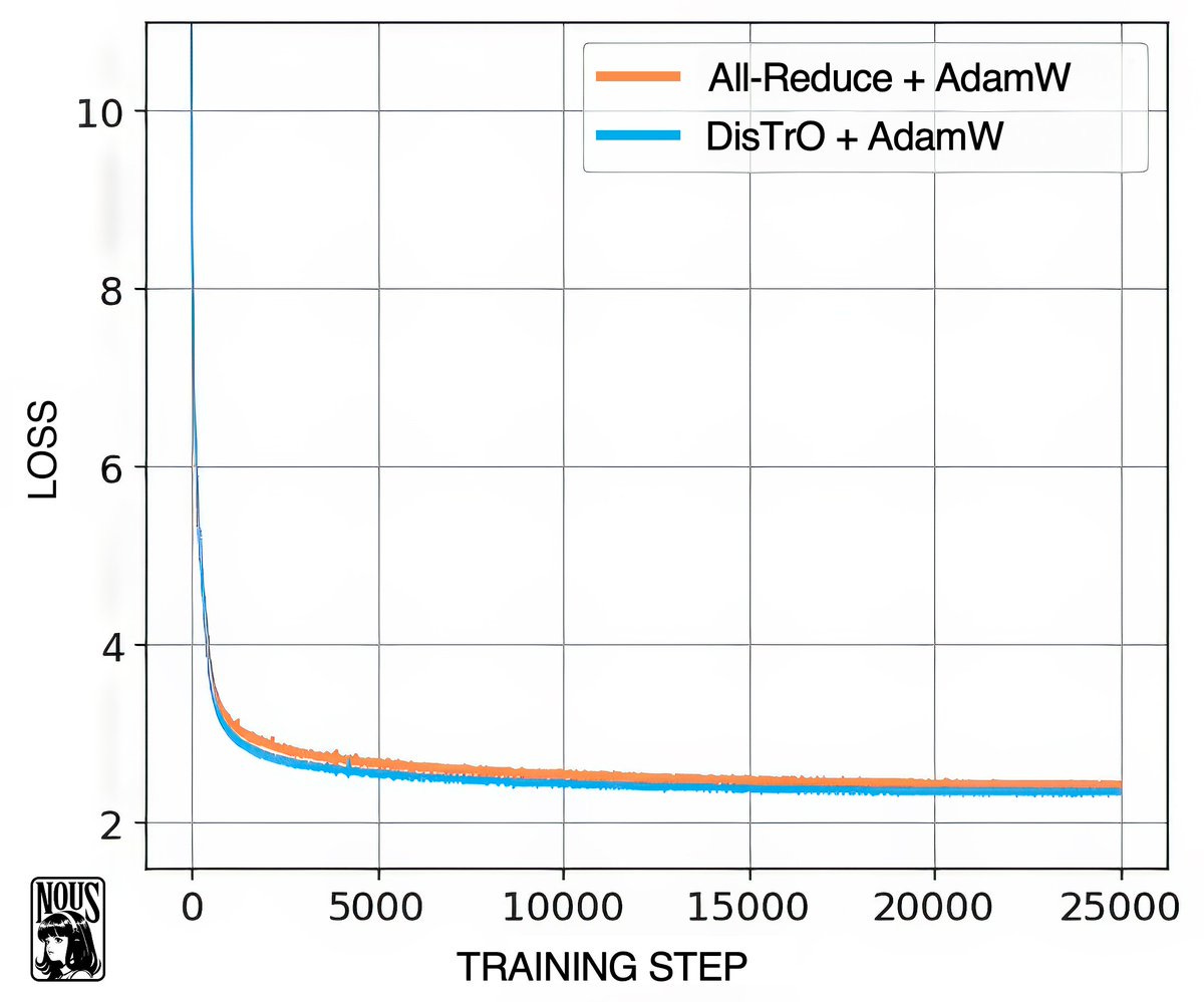 Nous Research was on fire this week (aren't they always?) and they kicked off the week with the release of DiStRO, which is a breakthrough in distributed training. You see, while LLM training requires a lot of hardware, it also requires a lot of network bandwidth between the different GPUs, even within the same data center.