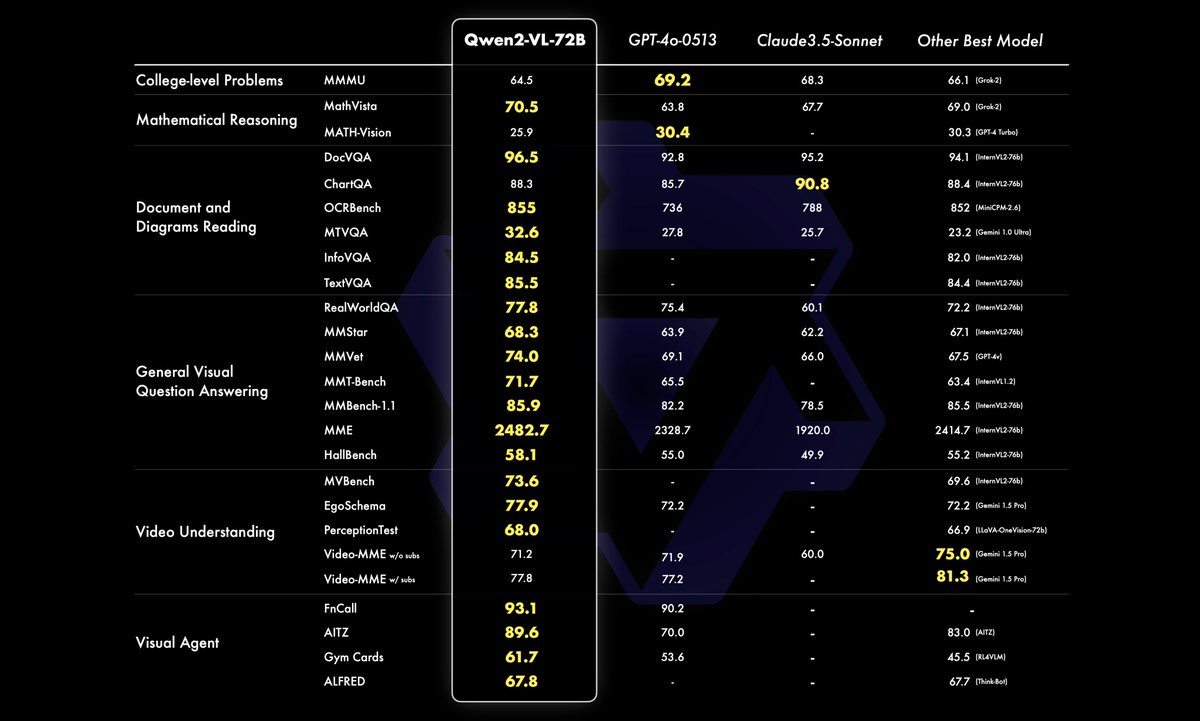 First of all, their Qwen-2 VL 72B model, is now SOTA at many benchmarks, beating GPT-4, Claude 3.5 and other much bigger models. This is insane. I literally had to pause Junyang and repeat what he said, this is a 72B param model, that beats GPT-4o on document understanding, on math, on general visual Q&A.