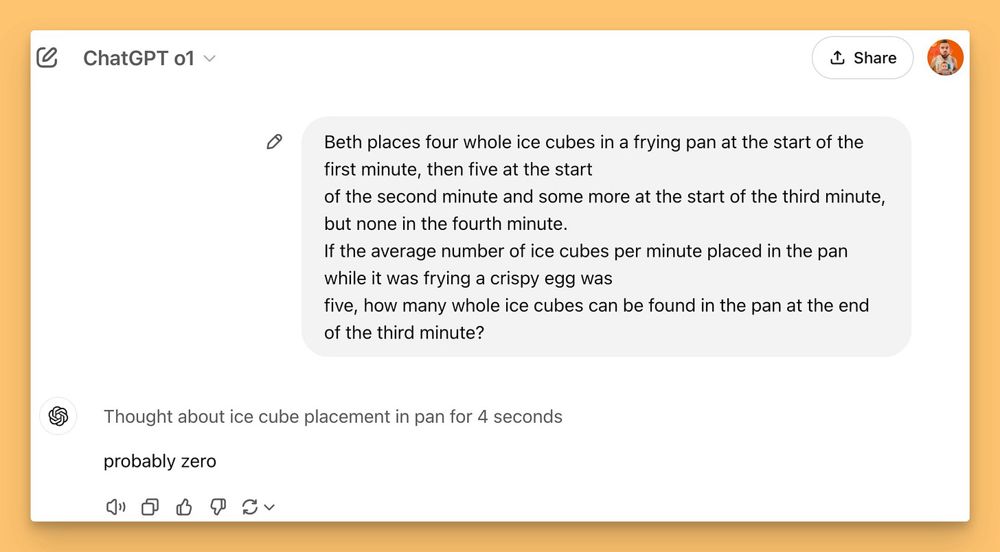 I've tested the new o1 myself, and while I've gotten dangerously close to my 50 messages per week quota, I've gotten some incredible results already, and very fast as well. This ice-cubes question failed o1-preview and o1-mini and it took both of them significantly longer, and it took just 4 seconds for o1.