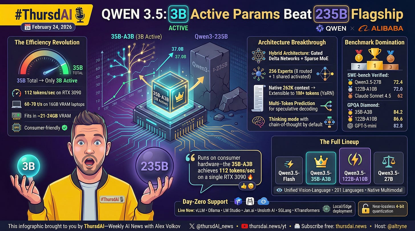 • Alibaba: Qwen 3.5 Medium - 35B model with only 3B active parameters outperforms their previous 235B flagship (X, HF, HF, HF, Blog)