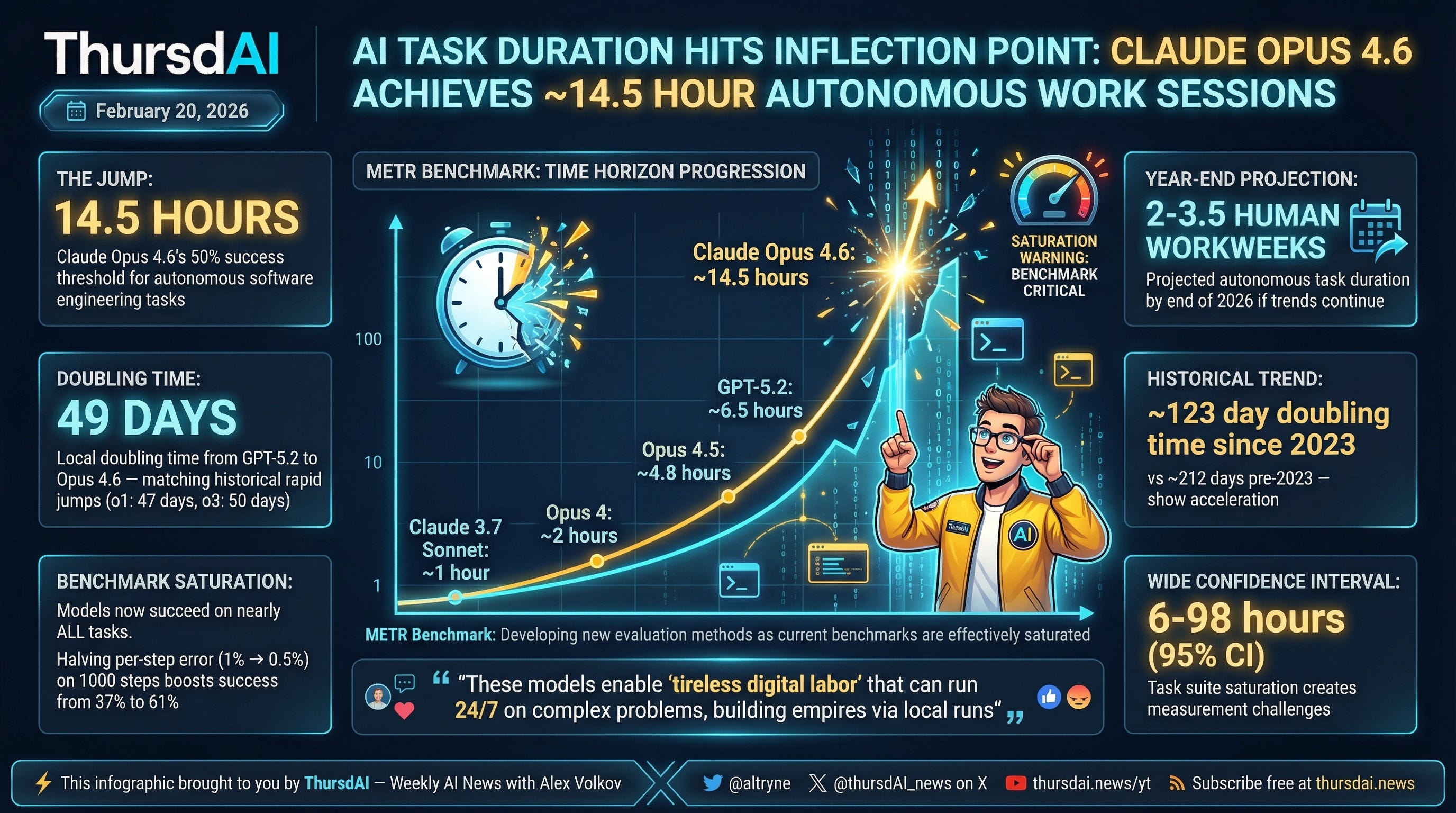 • METR’s Time Horizon Benchmark Goes Vertical: Claude Opus 4.6 Achieves ~14.5 Hour Task Completion (X, Blog)