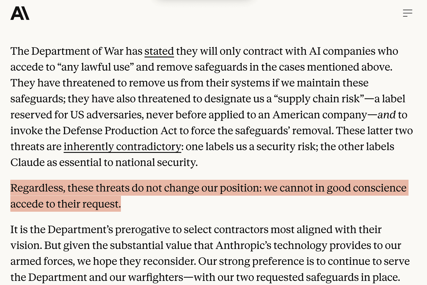 As I’m writing this, Anthropic issued a statement from Dario statement saying they will not budge on this, and will not comply. I fully commend Dario and Anthropic for this very strong backbone, but I fear that this matter is far from over, and we’ll continue to see what is the government response.