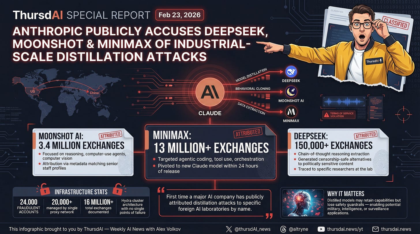 It’s baffling just how many balls are in the air for Anthropic, as just this week also, they have publicly named 3 Chinese AI makers in “Distillation Attacks”, claiming that they have broke Terms of Service to generate over 16M conversations with Claude to improve their own models, while using proxy networks to avoid detection. This marks the first time a major AI company publicly attributed distillation attacks to specific entities by name.