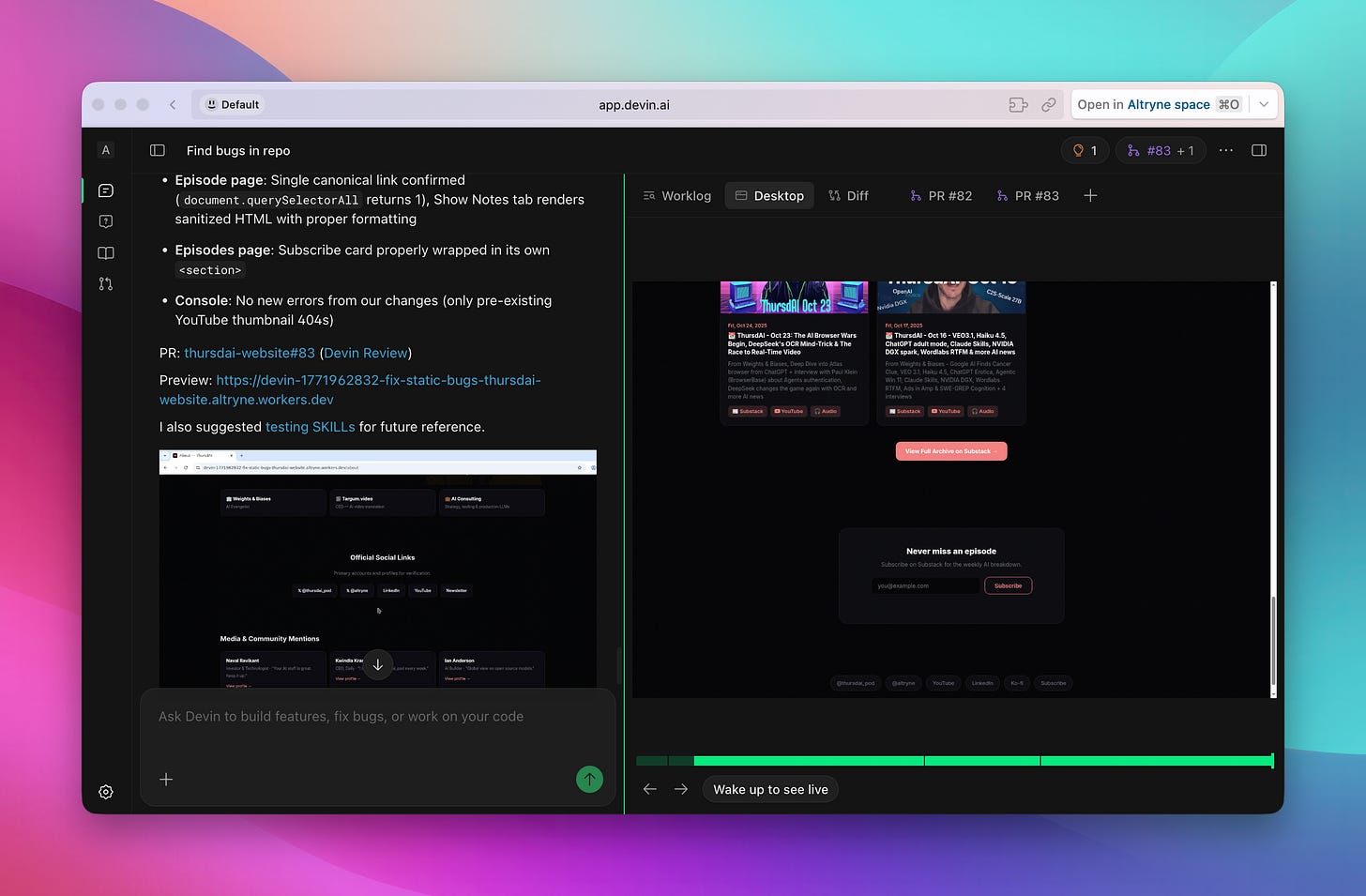 I’ve gotten access and chatted with Nader Dabit on the show about how Devin was the “OG” async coding Agent, but now as models capabilities are here, Devin can do so much more. PR reviews with devinreview.com can complete the loop between coding, fixing and testing something end to end. They have an integrated environment with a scrub so you can roll back and see what the agent did, scheduled tasks and video showing you how the agent tested your website.