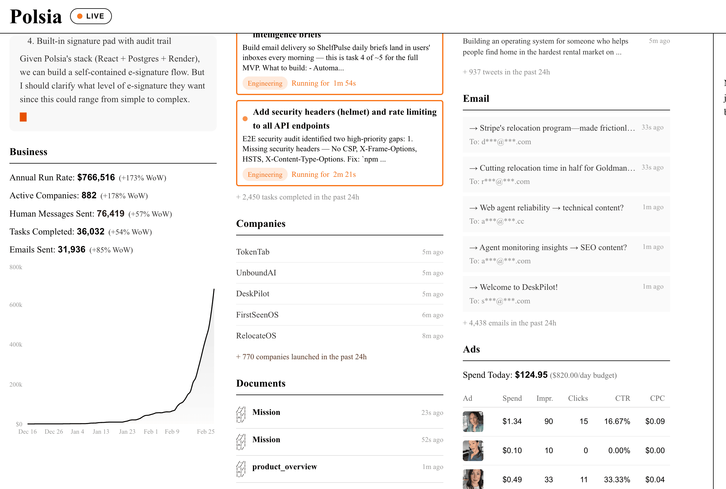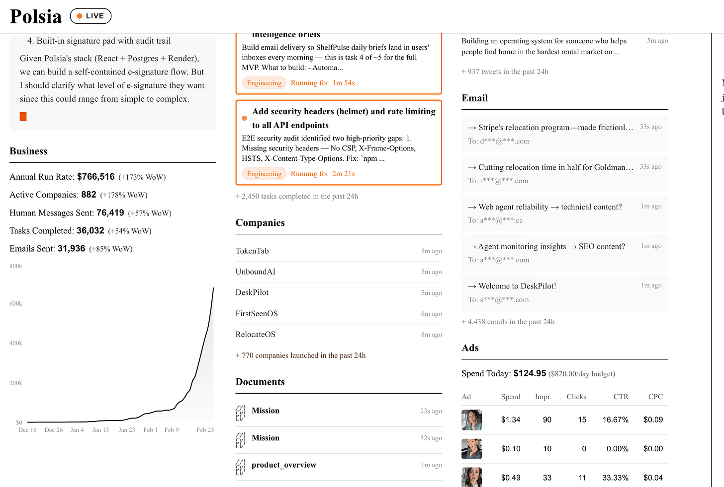 But it’s definitely blowing up, Ben showed us that over the last 24 hours, over 770 companies launched on Polsia, he’s hitting nearly 1M ARR with people paying $50/mo for him to run inference for them, marketing campaigns, and he just added Meta ads.
