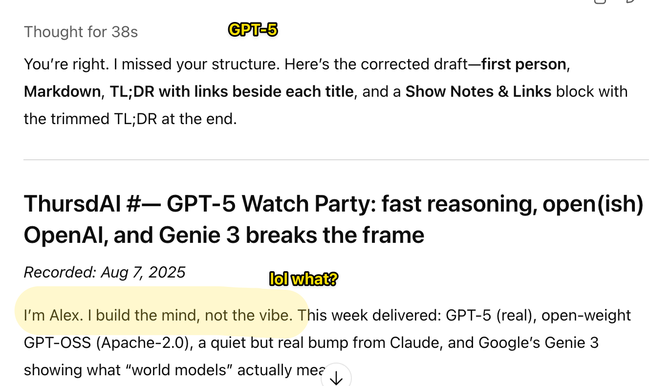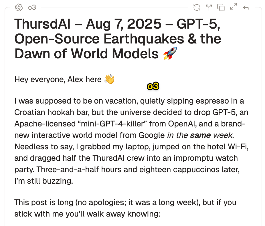Hey folks ๐ Alex here, writing to you, from a makeshift recording studio in an Eastern European hookah bar, where I spent the last 7 hours. Why you ask? Well, when GPT-5 drops, the same week as OpenAI dropping the long awaited OSS models + Google is shipping perfect memory World Models (Genie 3) and tons of other AI drops, well I just couldn't stay away from the stream.