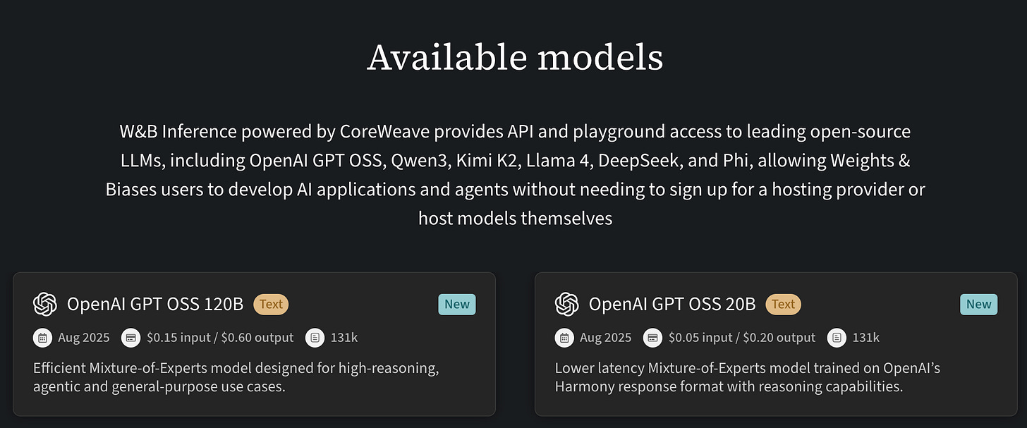 Speaking of open models, did you have a chance to try our W&B Inference? The team worked hard to bring these new models to you in record time and incredible pricing (just $.05 for 20B and $.15 for 120B!), these models are definitely worth giving a try!