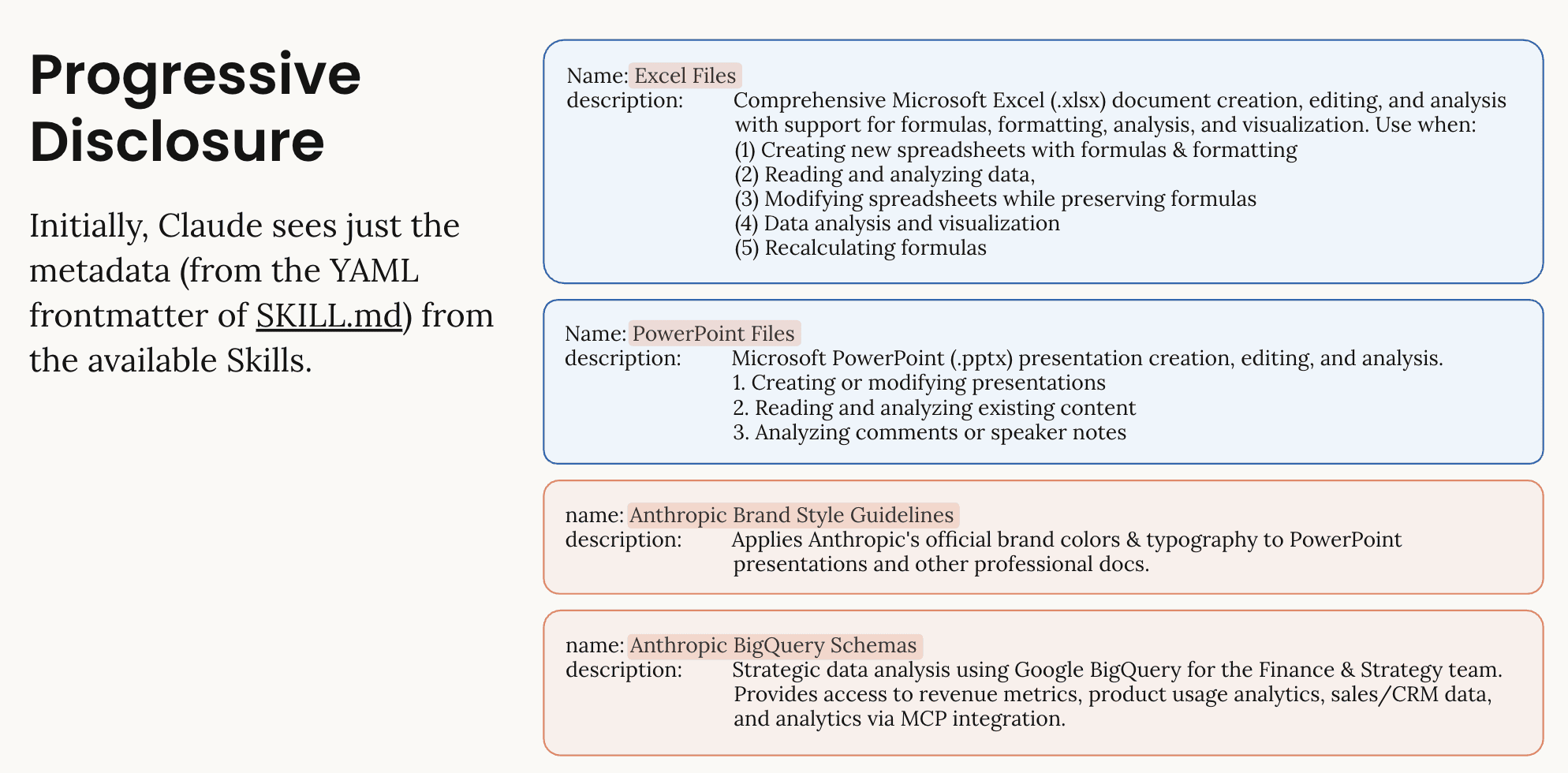 Skills are simple markdown files with a tiny bit of metadata in a directory together optional scripts, references, and assets. The key idea is progressive disclosure. Instead of stuffing your entire knowledge base into the context, the model only sees a small list of skills and let it load only what it needs. That means you can have hundreds of skills without blowing your context window (and making the model dumber and slower in result)