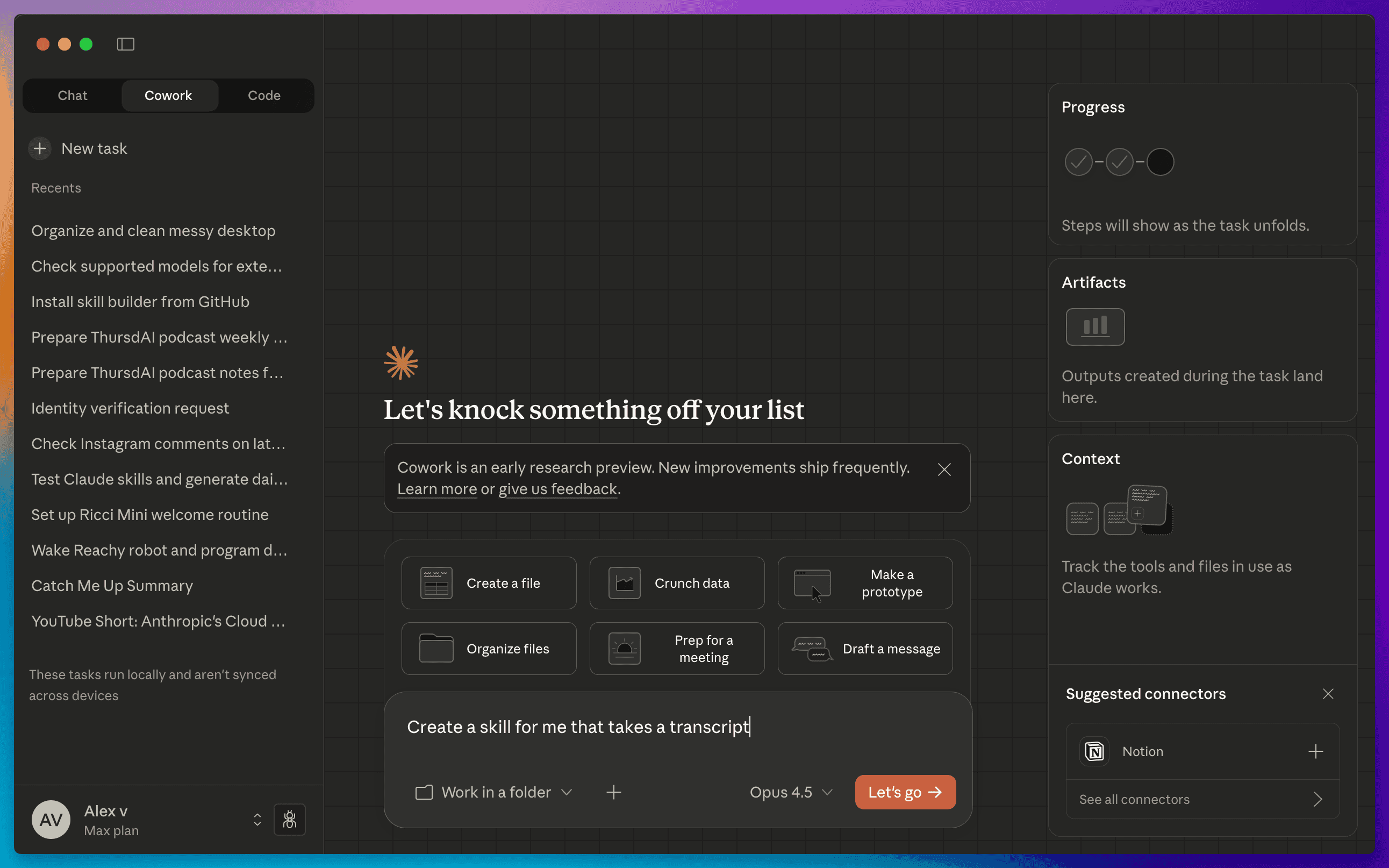 It also isn’t just for files—it comes with a Chrome connector, meaning it can navigate the web to gather info, download receipts, or do research and it uses skills (more on those later)