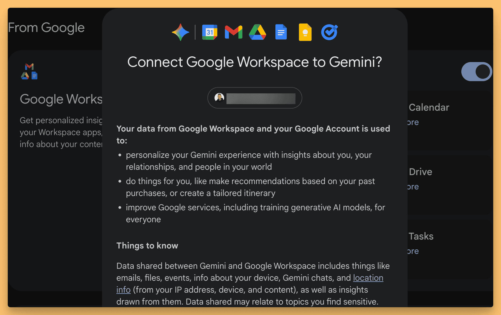 I got to try it early, and it’s uncanny. I asked Gemini what car I drive, and it told me I likely drive a Model Y, but it noticed I recently searched for a Honda Odyssey and asked if I was thinking about switching. It was kinda... freaky because I forgot I had early access and this was turned on 😂