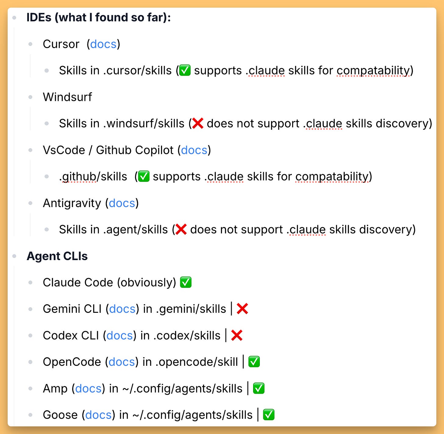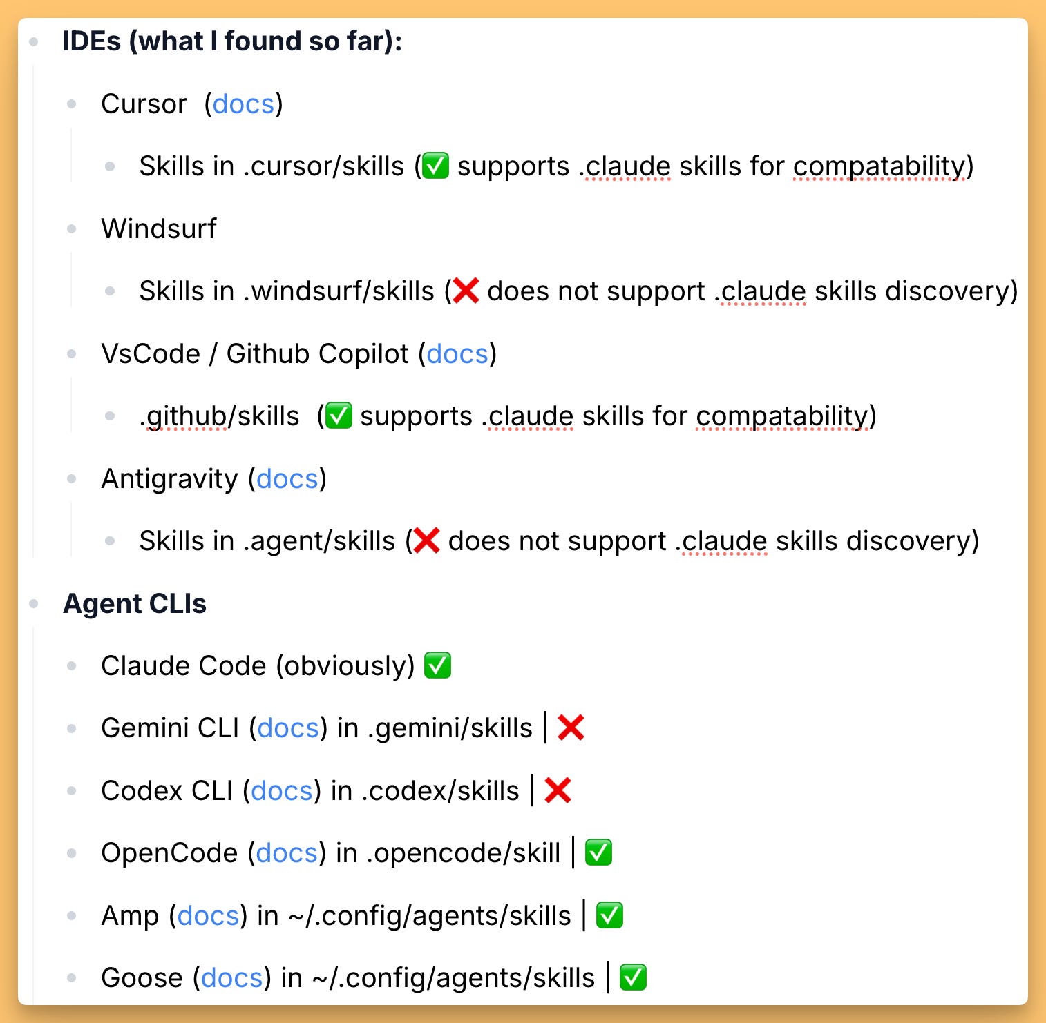 The technical structure is dead simple, but the implications are huge. Skills create a portable, reusable, composable way to give agents domain expertise, and they now work across most major harnesses. That means you can build a skill once and use it in Claude, Cursor, AMP, or any other agent tool that supports the standard.
