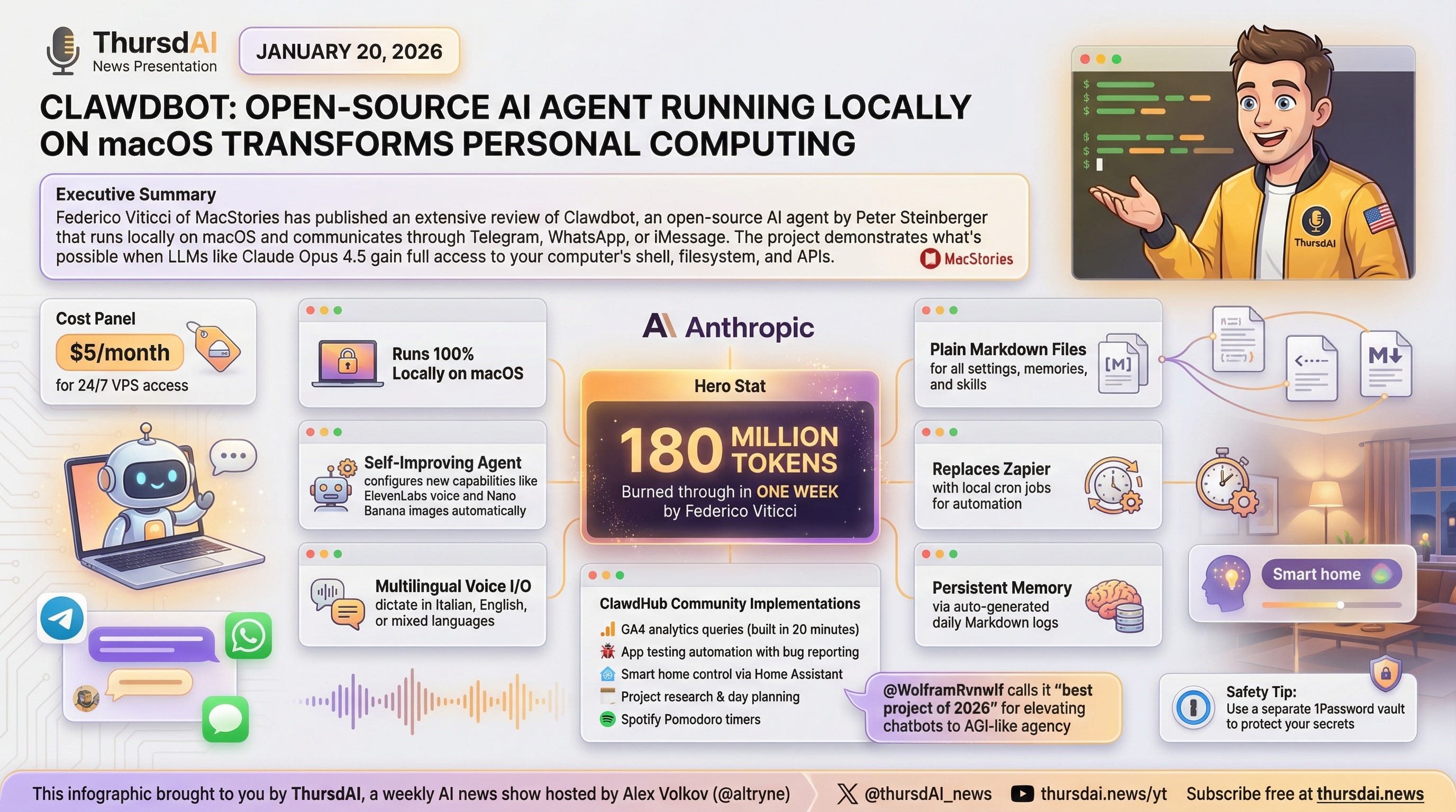 This week’s deep dive is into Clawdbot, a personal AI assistant you install on your computer, but can control through your phone, has access to your files, is able to write code, help organize your life, but most importantly, it can self improve. Seeing Wolfred (my Clawdbot) learn to transcribe incoming voice messages blew my mind, and I wanted to share this one with you at length! We had Dan Peguine on the show for the deep dive + both Wolfram and Yam are avid users! This one is not to be missed. If ThursdAI is usually too technical for you, use Claude, and install Clawdbot after you read/listen to the deep dive!