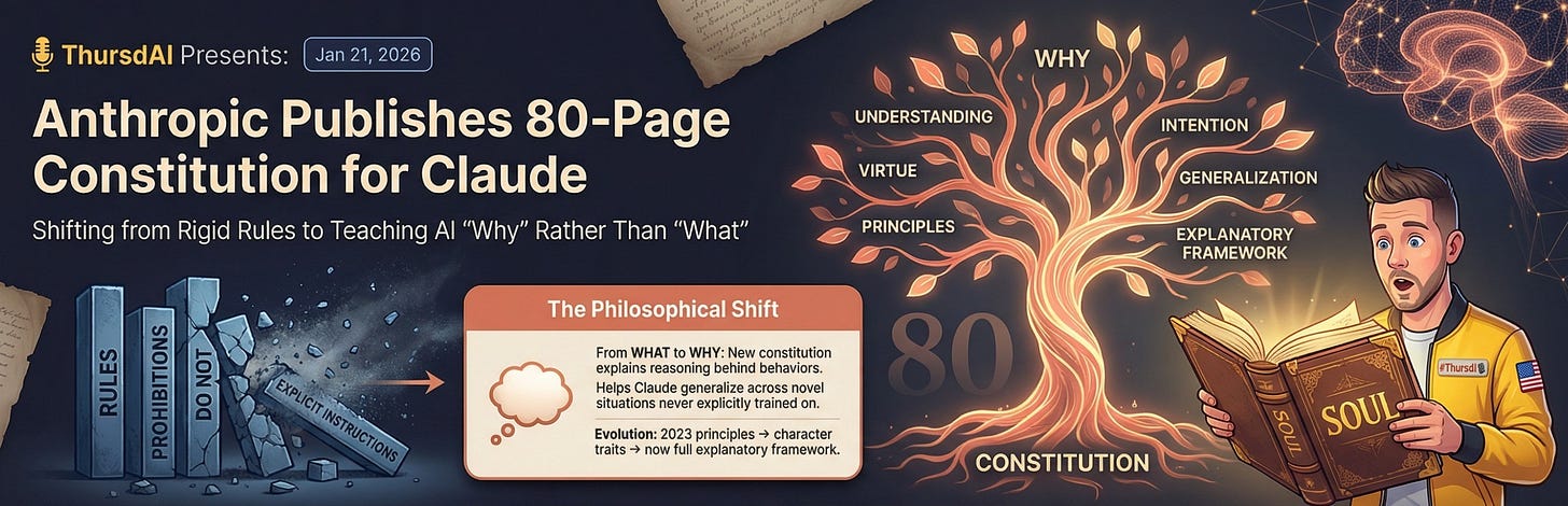 Anthropic publishes new 80-page constitution for Claude, shifting from rigid rules to explanatory principles that teach AI ‘why’ rather than ‘what’ to do (X, Blog, Announcement)