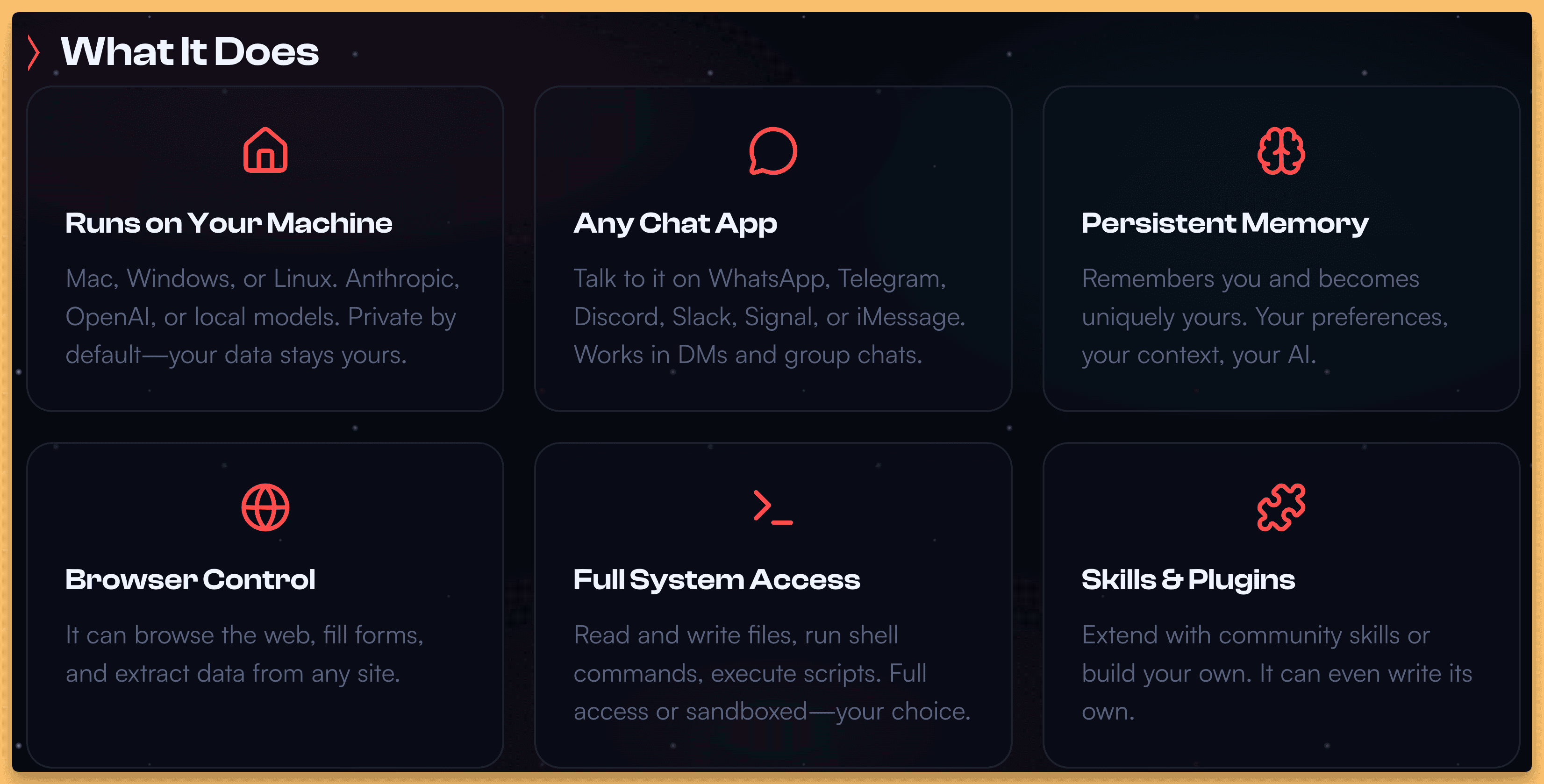 Clawdbot (C‑L‑A‑W‑D) is that rare project where the hype is justified. It’s an open-source personal agent that runs locally on your Mac, but can talk to you through WhatsApp, Telegram, iMessage, Discord, Slack — basically wherever you already talk. What makes it different is not just the integrations; it’s the self‑improvement loop. You can literally tell it “go build a new skill,” and it will… build the skill, install it, then adopt it and start using it. It’s kind of wild to see it working for the first time. Now... it’s definitely not perfect, far far away from the polish of ChatGPT / Claude, but when it works, damn, it really is mindblowing.