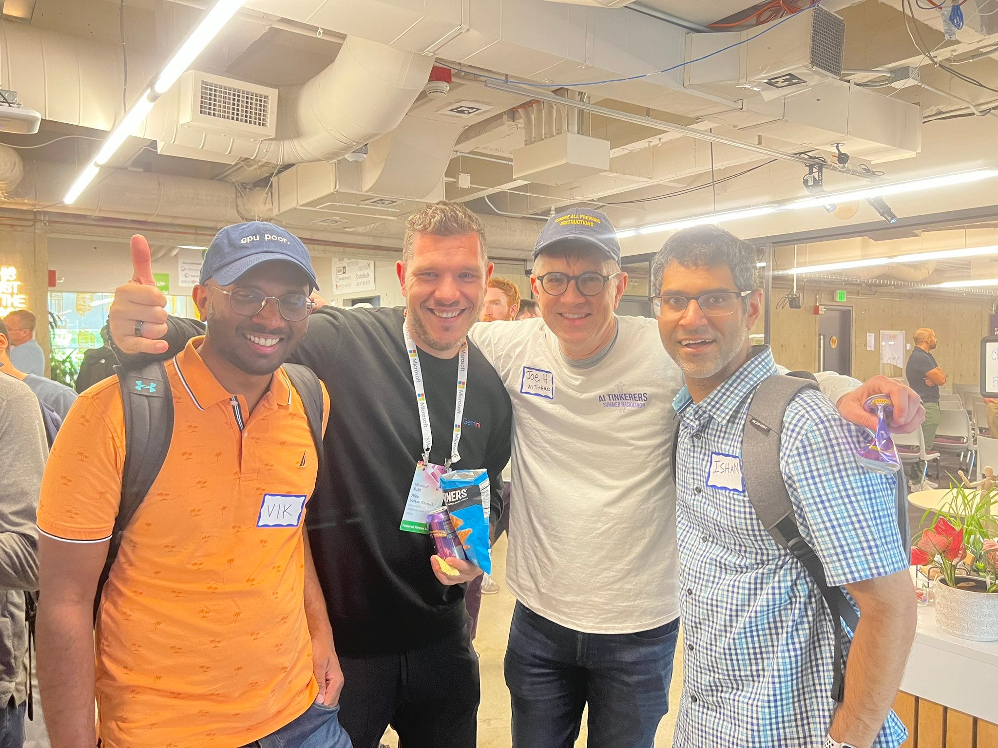 While I'm here I also had the pleasure to participate in the original AI tinkerers thanks to my friend Joe Heitzberg who operates and runs the aitinkerers.org (of which we are a local branch in Denver) and it was amazing to see tons of folks who listen to ThursdAI + read the newsletter and talk about Weave and evaluations with all of them! (Btw, one the left is Vik from Moondream, which we covered multiple times). I