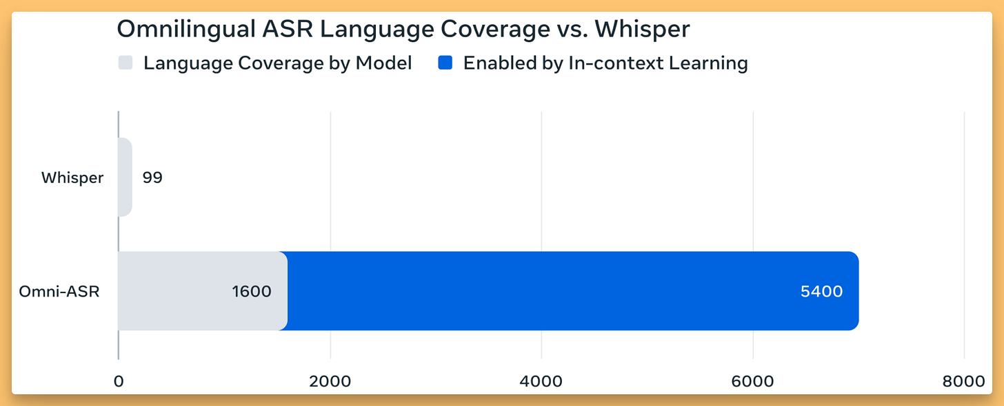 On the other end of the spectrum, Meta released something that’s less about ultra‑low latency and more about sheer linguistic coverage: Omnilingual ASR. This is a family of models and a dataset designed to support speech recognition for more than 1,600 languages, including about 500 that have never had any ASR support before. That alone is a massive contribution.