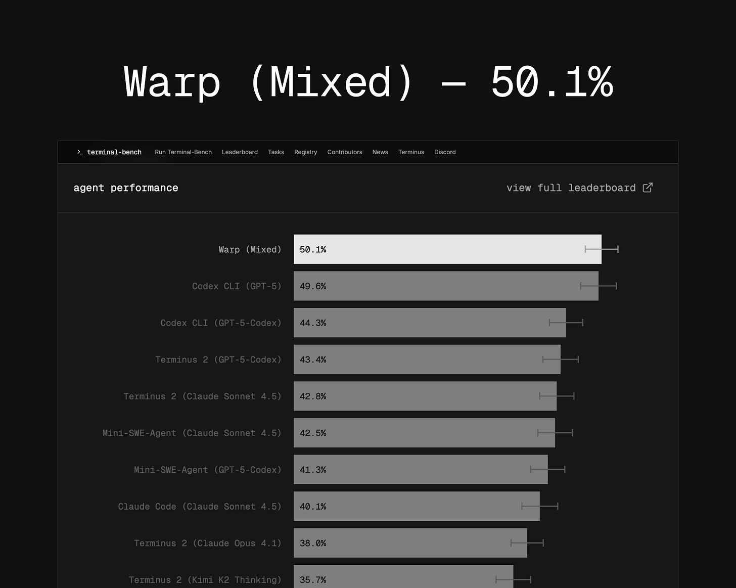 On the new leaderboard, top agents like Warp’s agentic console and Codex CLI + GPT‑5 sit around fifty percent success. That number is exactly what excites me: we’re nowhere near saturation. When everyone is in the 90‑something range, tiny 0.1 improvements are basically noise. When the best models are at fifty percent, a five‑point jump really means something.