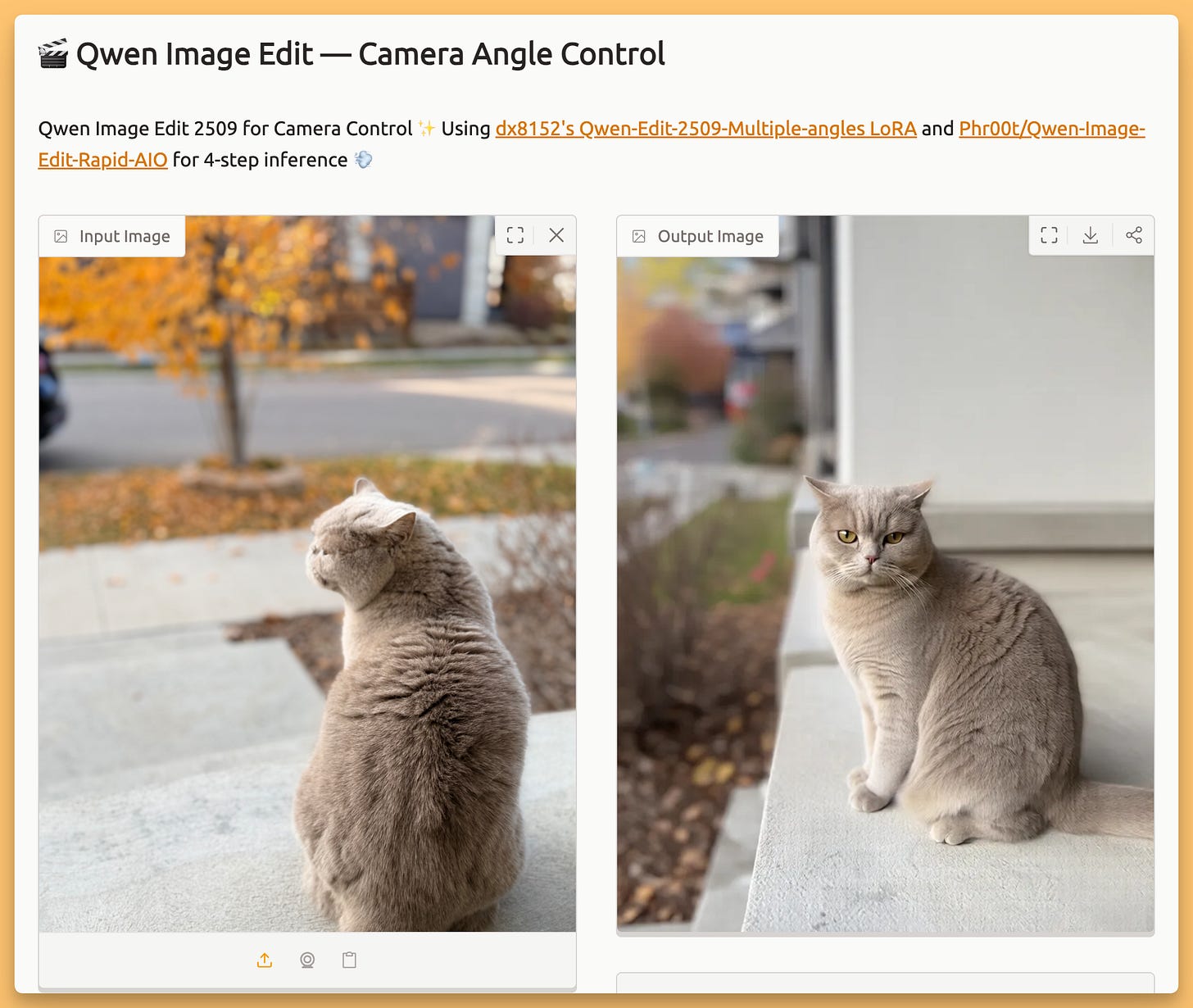 This one was pure fun. A new set of LoRAs for Qwen Image Edit adds direct camera control to still images. A Hugging Face demo lets you upload a photo and use sliders to rotate the camera up to 90 degrees, tilt from a bird’s‑eye to a worm’s‑eye view, and adjust the lens. We played with it live on the show with a portrait of Wolfram and a photo of my cat, generating different angles and then interpolating them into a short “fly‑around” video. It’s incredibly cool and preserves details surprisingly well, feeling like you have a virtual camera inside a 2D picture.