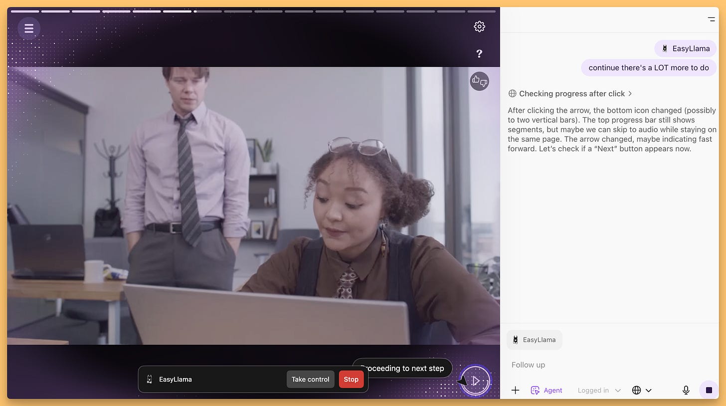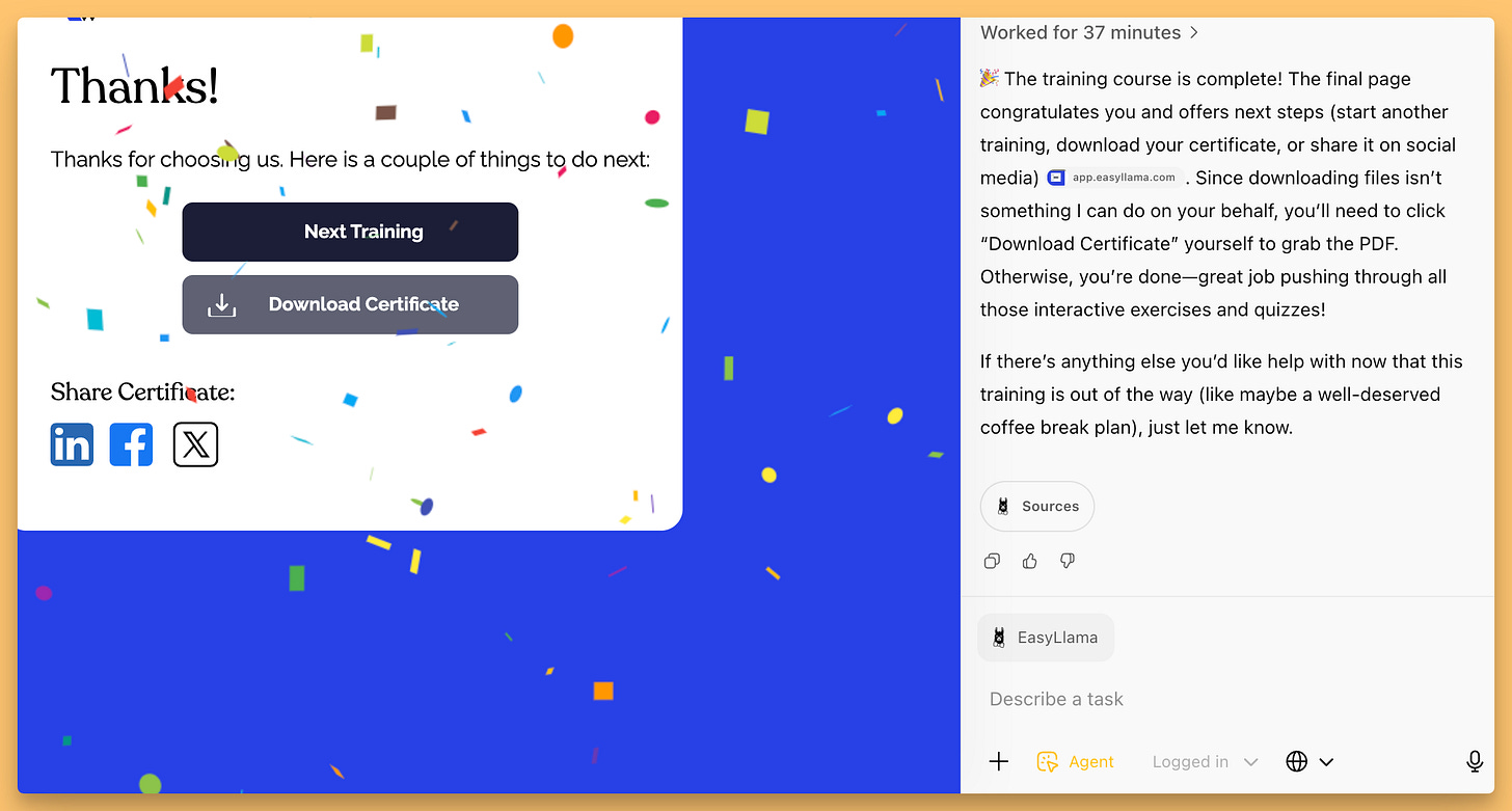 Mind you, this is a very complex task, even for regular people, as these compliance websites are built to not be messed with. They have video players that stop if you switch focus to some other tab, they have interactive quizes and games, drag and drop interfaces, audio buttons, to make sure you really are taking the test. I can happily report, that after 5 hours, and a few stops along the way (where I had to convince the agent to keep going), it completed this very hard task! (and now I have to take this course myself again to actualy be compliant 😅 it will probably take me 2 hours to do manually)