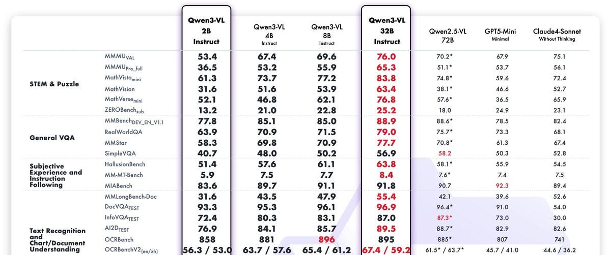 The Qwen models are particularly interesting, as the 2B model is a generic VLM (can also do OCR) and is close to previous weeks 4B and 8B brothers, and the newly updated 32B model outperforms GPT-5 mini and Claud 4 sonnet even!