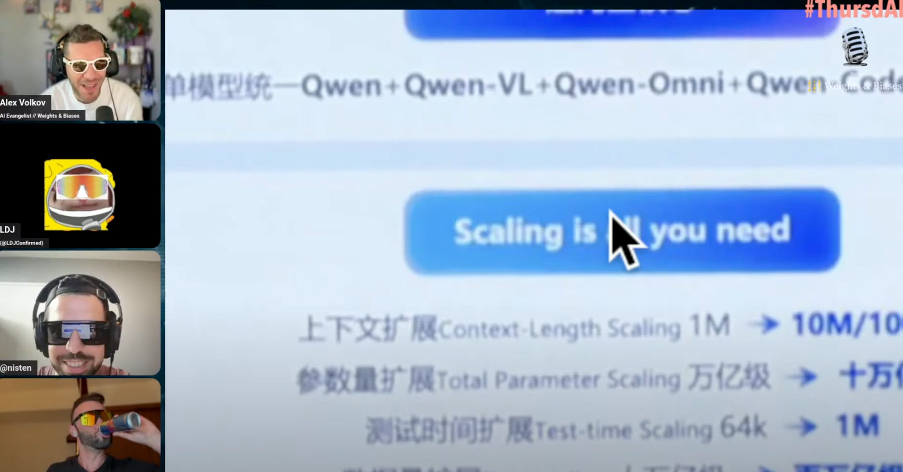 And their plan is simple: scale. Theyâre planning to go from 1 million to 100 million token context windows and scale their models into the terabytes of parameters. It culminated in a hilarious moment on the show where we all put on sunglasses to salute a slide from their presentation that literally said, âScaling is all you need.â AGI is coming, and it looks like Alibaba is one of the labs determined to scale their way there. Their release schedule lately (as documented by Swyx from Latent.space) is insane.