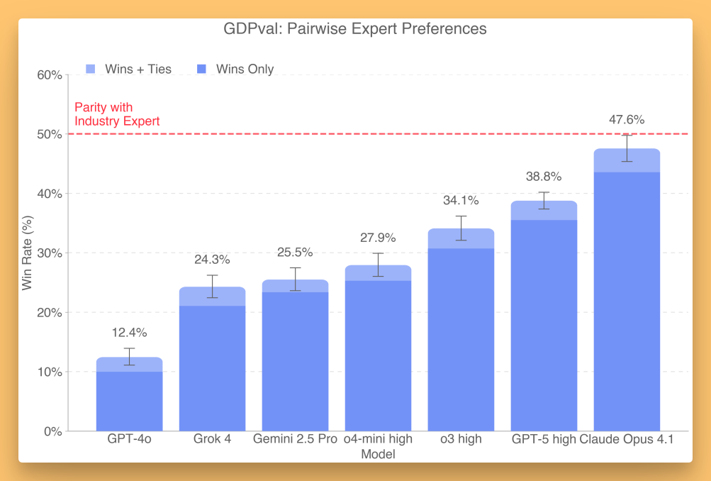 What I like here isnât the precise percent; itâs the direction. If we anchor progress to tasks an economy cares about, we move past âtrivia with citationsâ and toward âdid this thing actually help do the work?â
