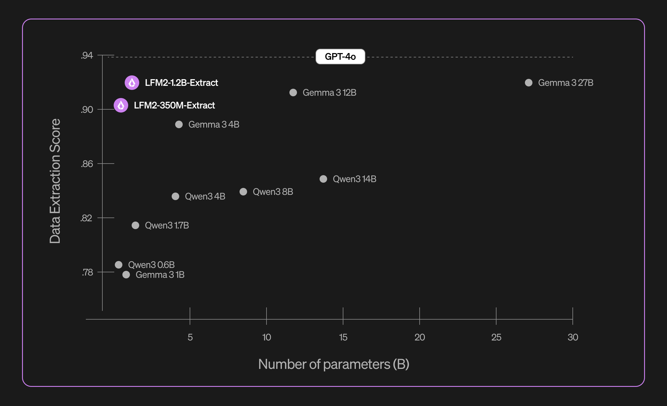 Liquid Foundation Models released âLiquid Nanos,â a set of open models from roughly 350M to 2.6B parameters, including âextractâ variants that pull structure (JSON/XML/YAML) from messy documents. The pitch is cost-efficiency with surprisingly competitive performance on information extraction tasks versus models 10Ă their size. If youâre doing at-scale doc ingestion on CPUs or small GPUs, these look worth a try.
