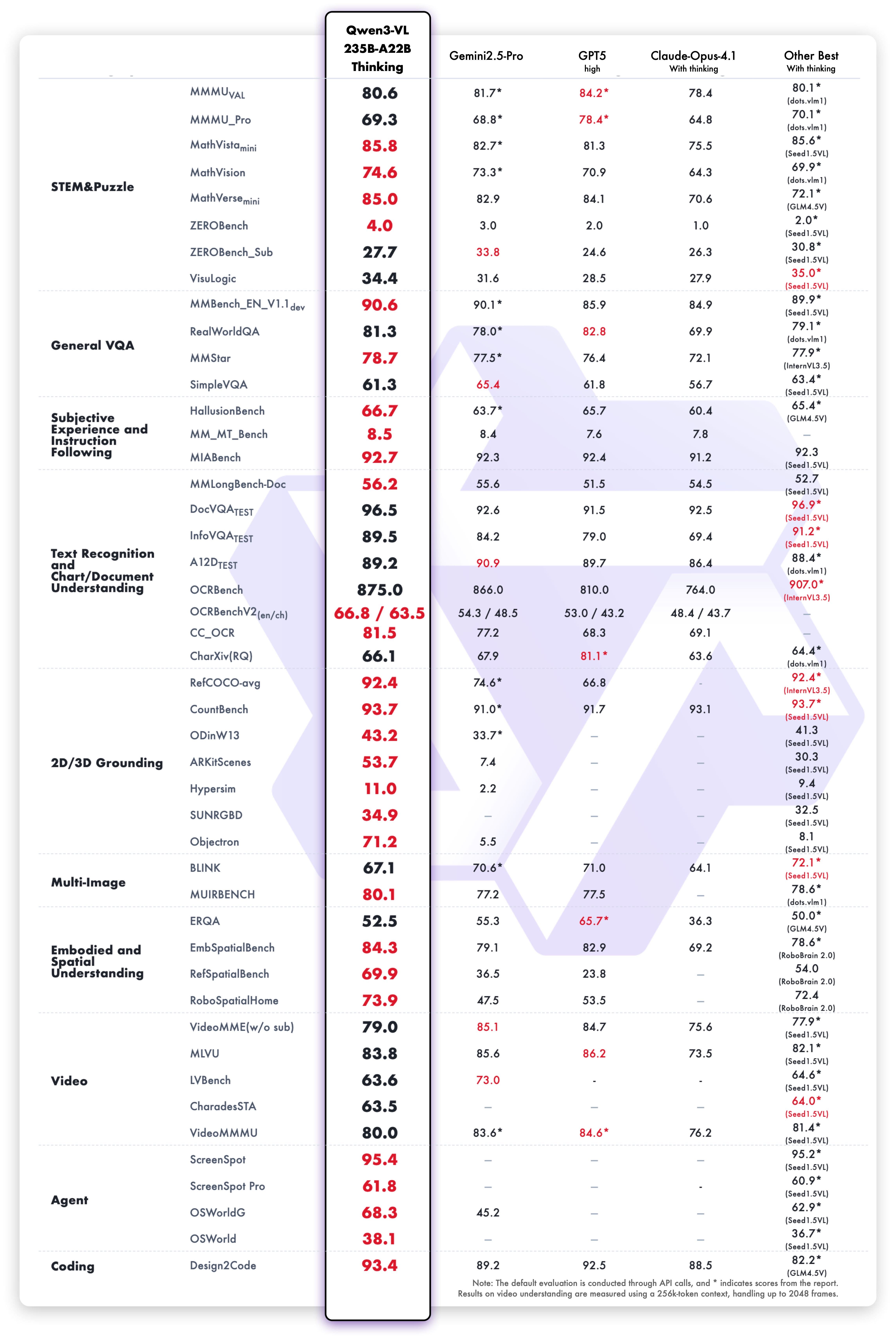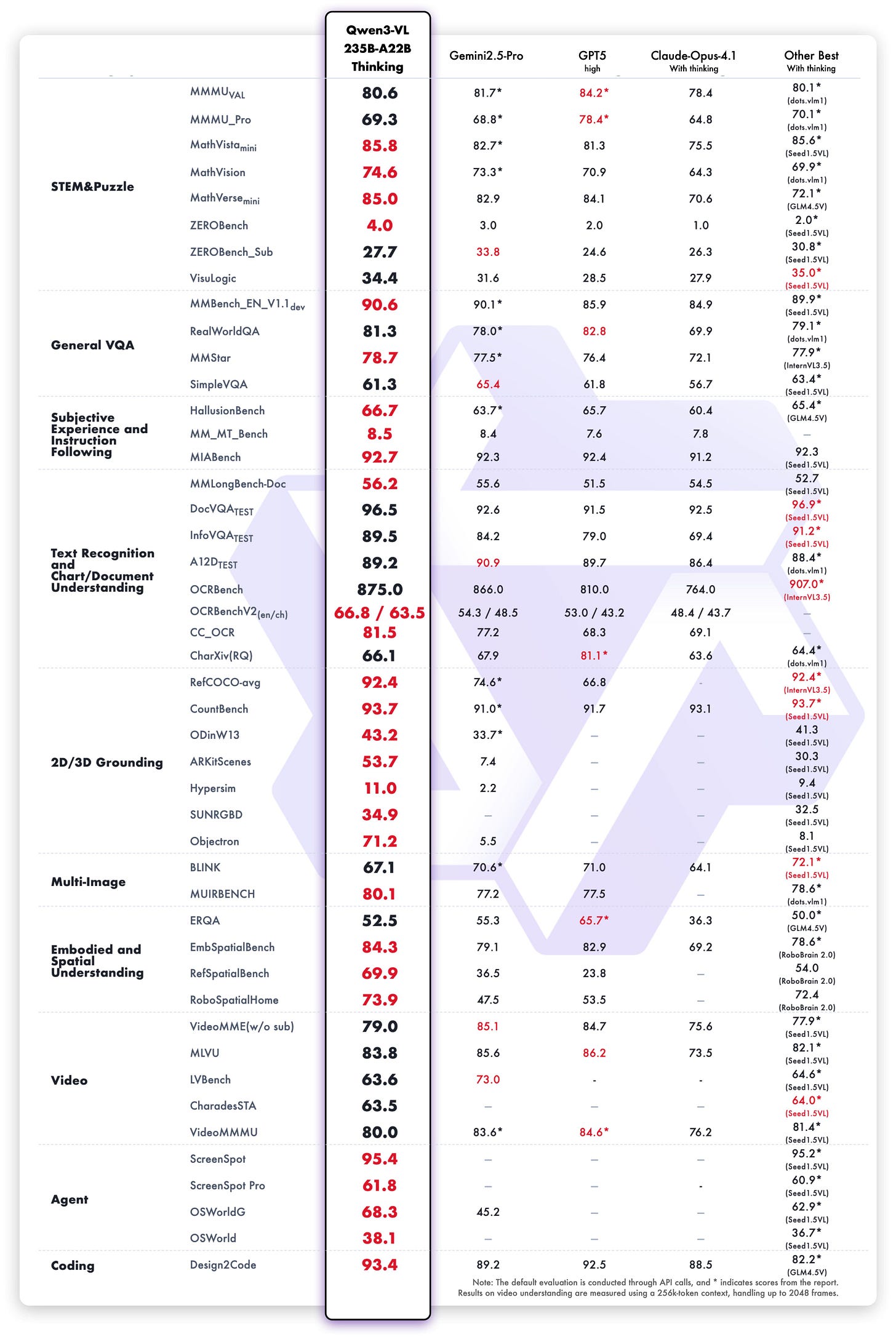 Qwen 3 launched earlier as a text-only family; the vision-enabled variant just arrived, and itâs not timid. The âthinkingâ version is effectively a reasoner with eyes, built on a 235B-parameter backbone with around 22B active (their mixture-of-experts trick). What jumped out is the breadth of evaluation coverage: MMU, video understanding (Video-MME, LVBench), 2D/3D grounding, doc VQA, chart/table reasoningâpages of it. Theyâre showing wins against models like Gemini 2.5 Pro and GPTâ5 on some of those reports, and doc VQA is flirting with ânearly solvedâ territory in their numbers.